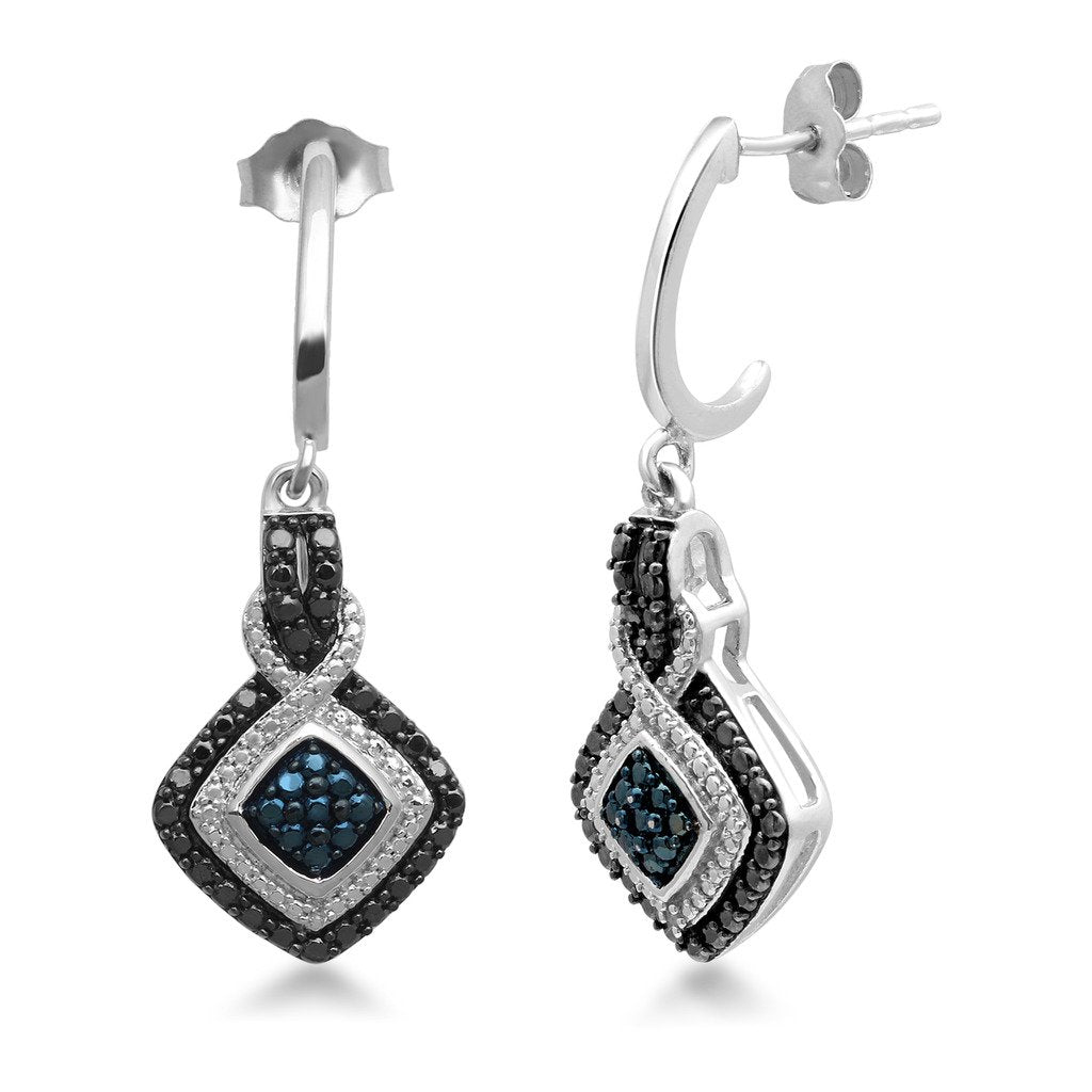Jewelili Sterling Silver and White Brass With White and Treated Blue, Black Diamonds Ring, Pendant Necklace and Dangle Earrings Box Set