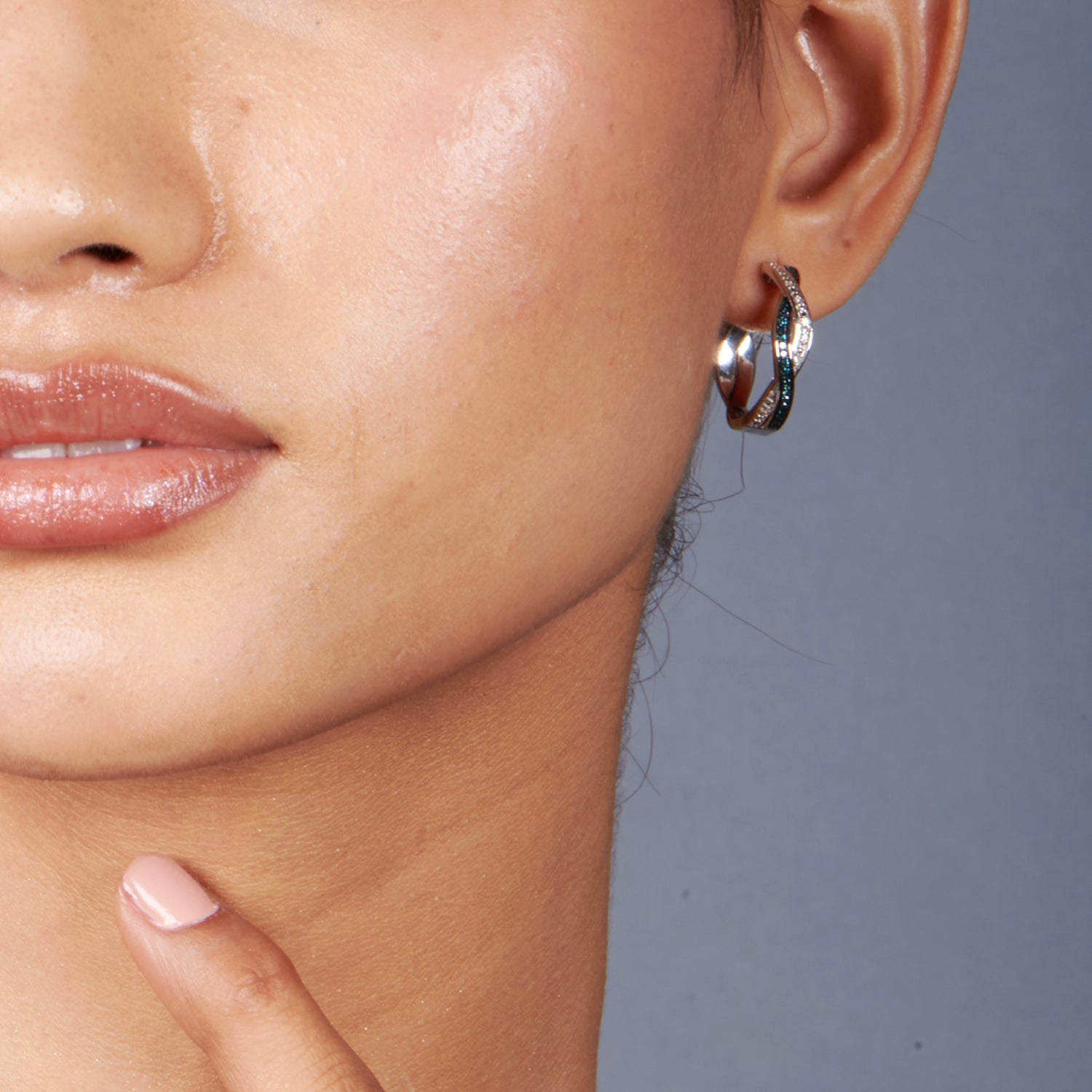 • 1/6cttw, Sterling silver Twist Hoop earrings studded with blue and white diamonds in pave setting. Secured with hinged back.