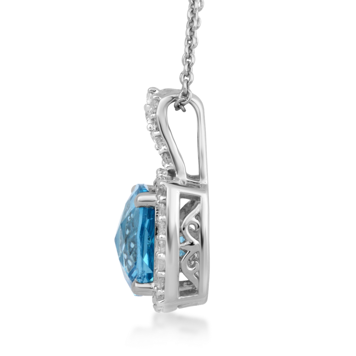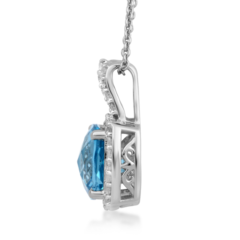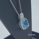 • Sterling silver necklace featuring cushion-cut Swiss blue topaz pendant suspended from triple-row bail of created white sapphires