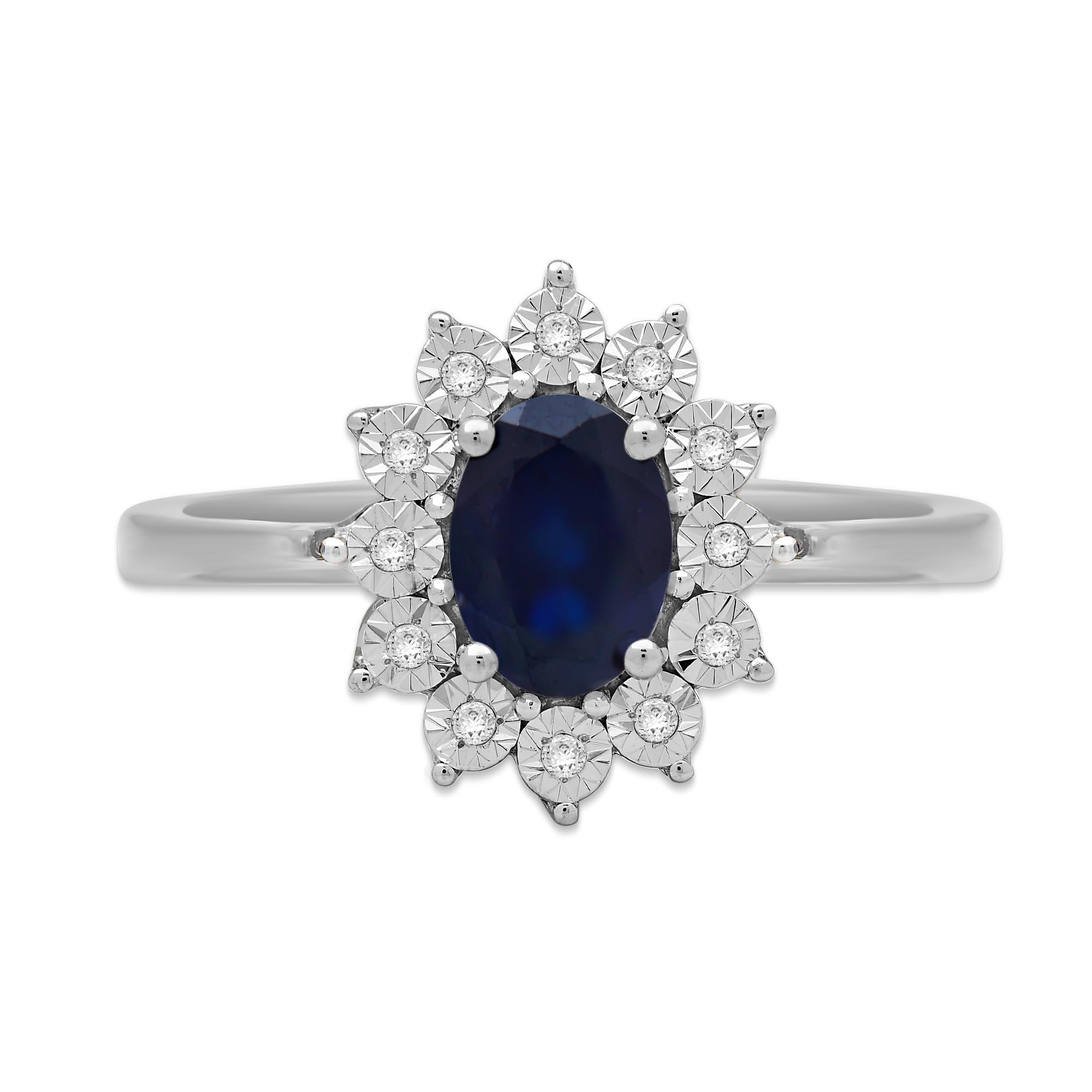 Jewelili Sterling Silver Created Blue Sapphire 1/20 CTTW Natural White Round Diamonds Flower Halo Engagement Ring