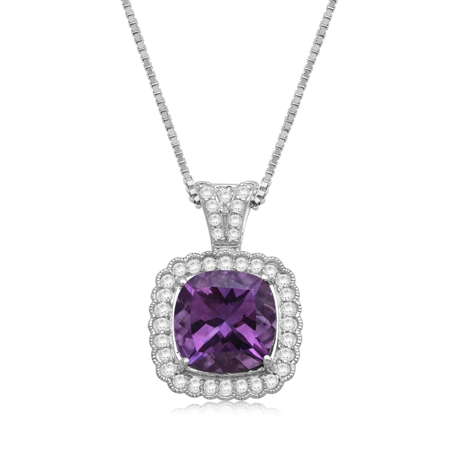 Details: Sterling Silver Cushion Cut Amethyst With Round White Topaz and Round Emerald Halo Pendant Necklace