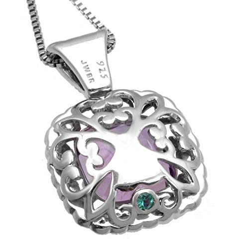 Jewelili Sterling Silver Cushion Cut Amethyst With Round White Topaz and Round Emerald Halo Pendant Necklace