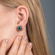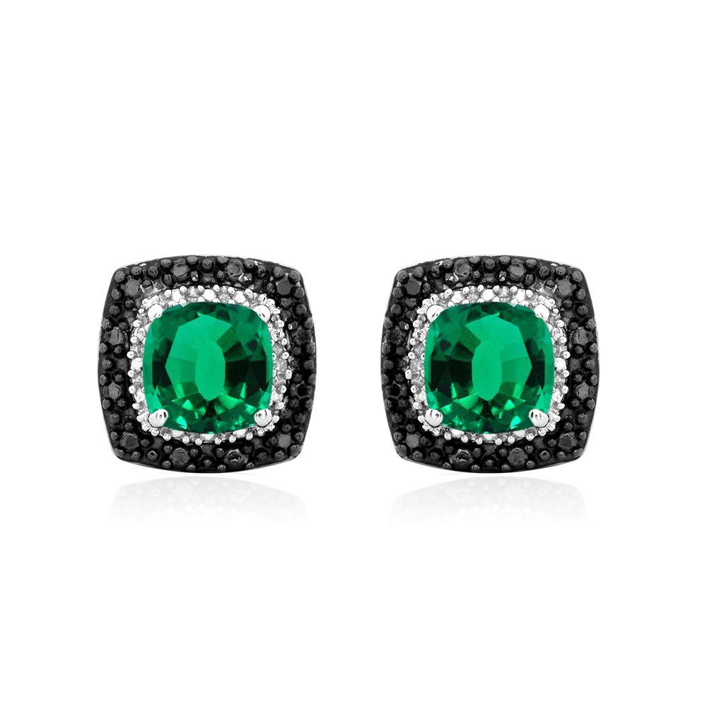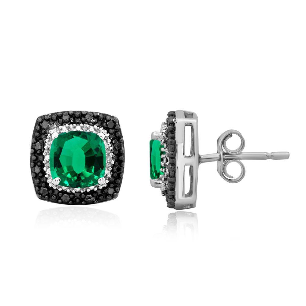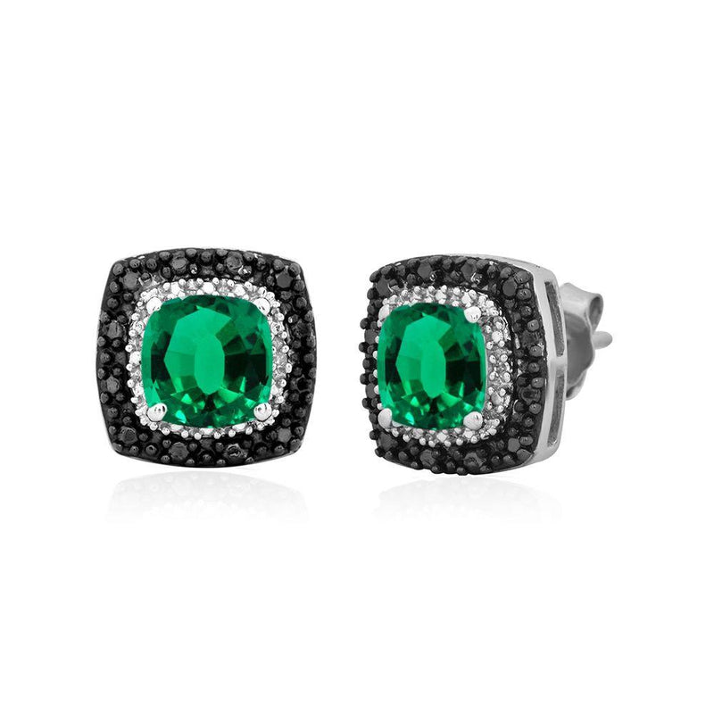 Details: Sterling Silver Cushion Shape Created Green Emerald with Treated Black and White Diamonds Stud Earrings