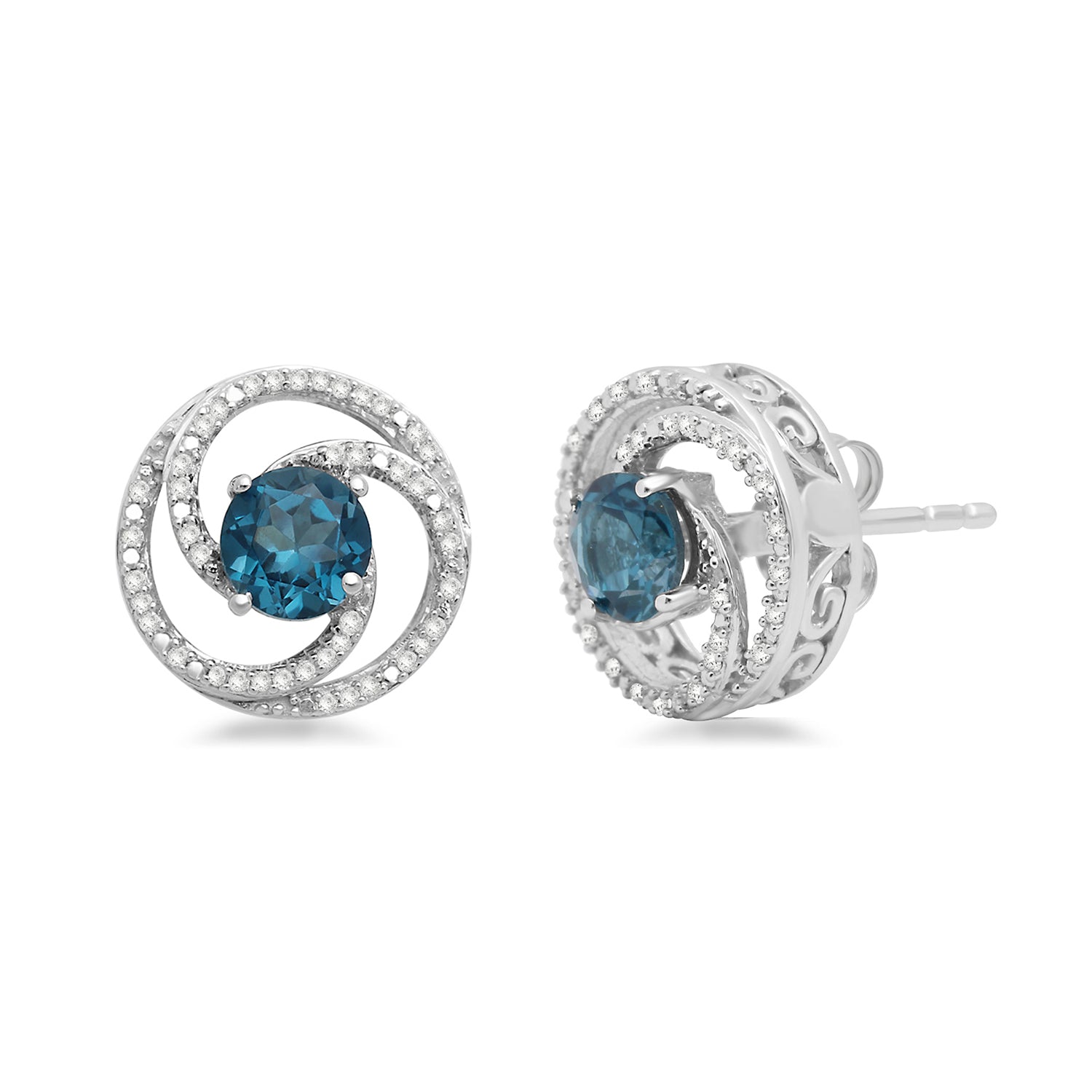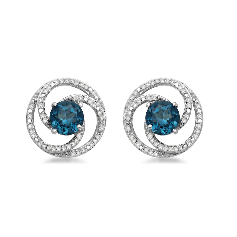 • 0.16 cttw, Sterling silver Round Swirl Stud Earrings with Coated Blue Topaz and Diamond. Secured with butterfly ear nut & post.