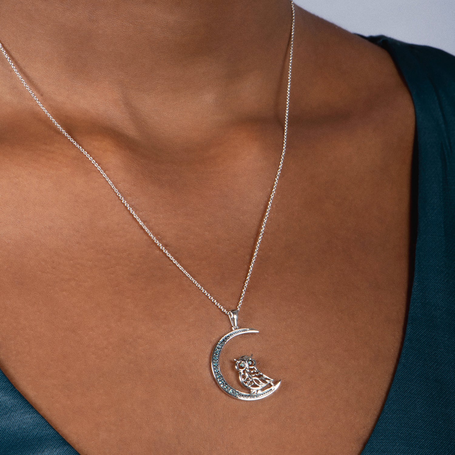 Details: Sterling silver Natural blue diamond accent Owl on Moon pendant necklace, 18" Rolo chain