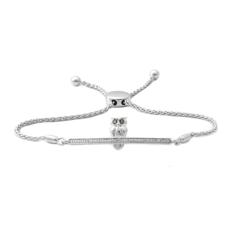 Jewelili Sterling Silver Natural Champagne and White Round Diamonds Owl Bolo Bracelet, 9.5"
