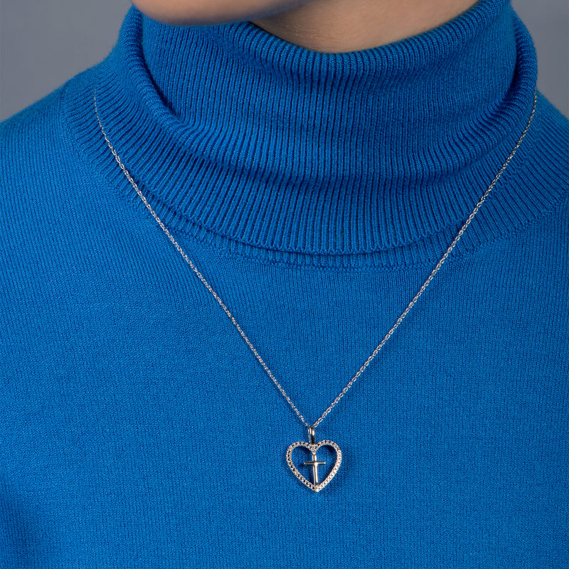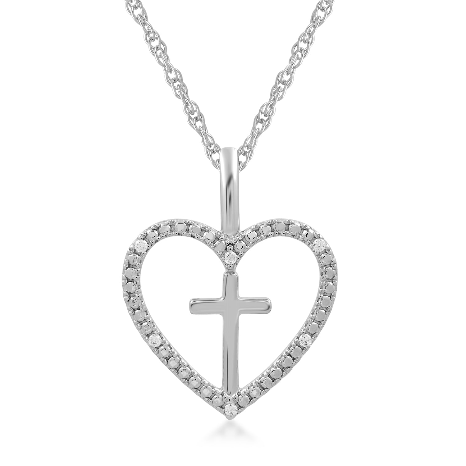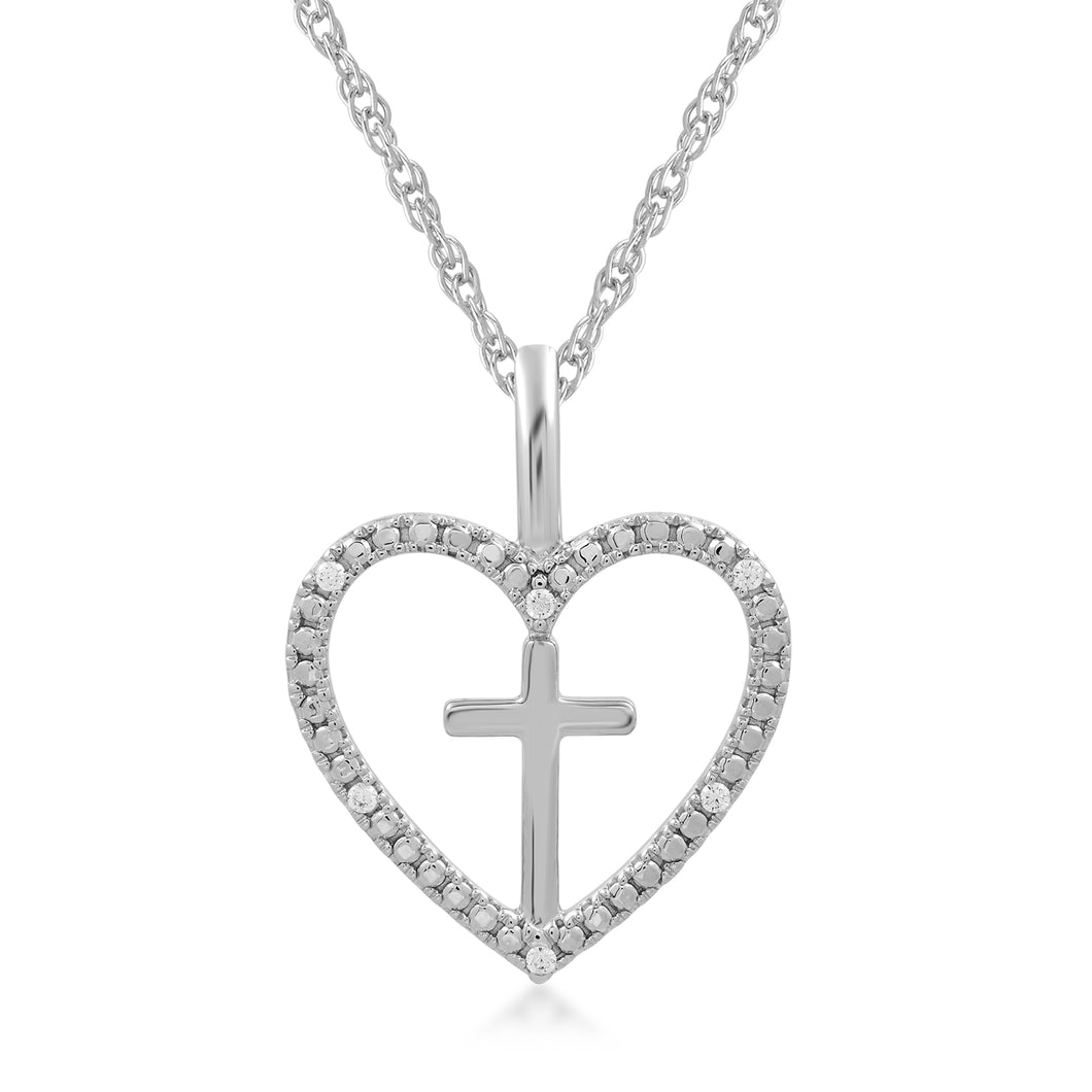 • Sterling Silver With Natural White Round Diamonds Cross Heart Pendant Necklace