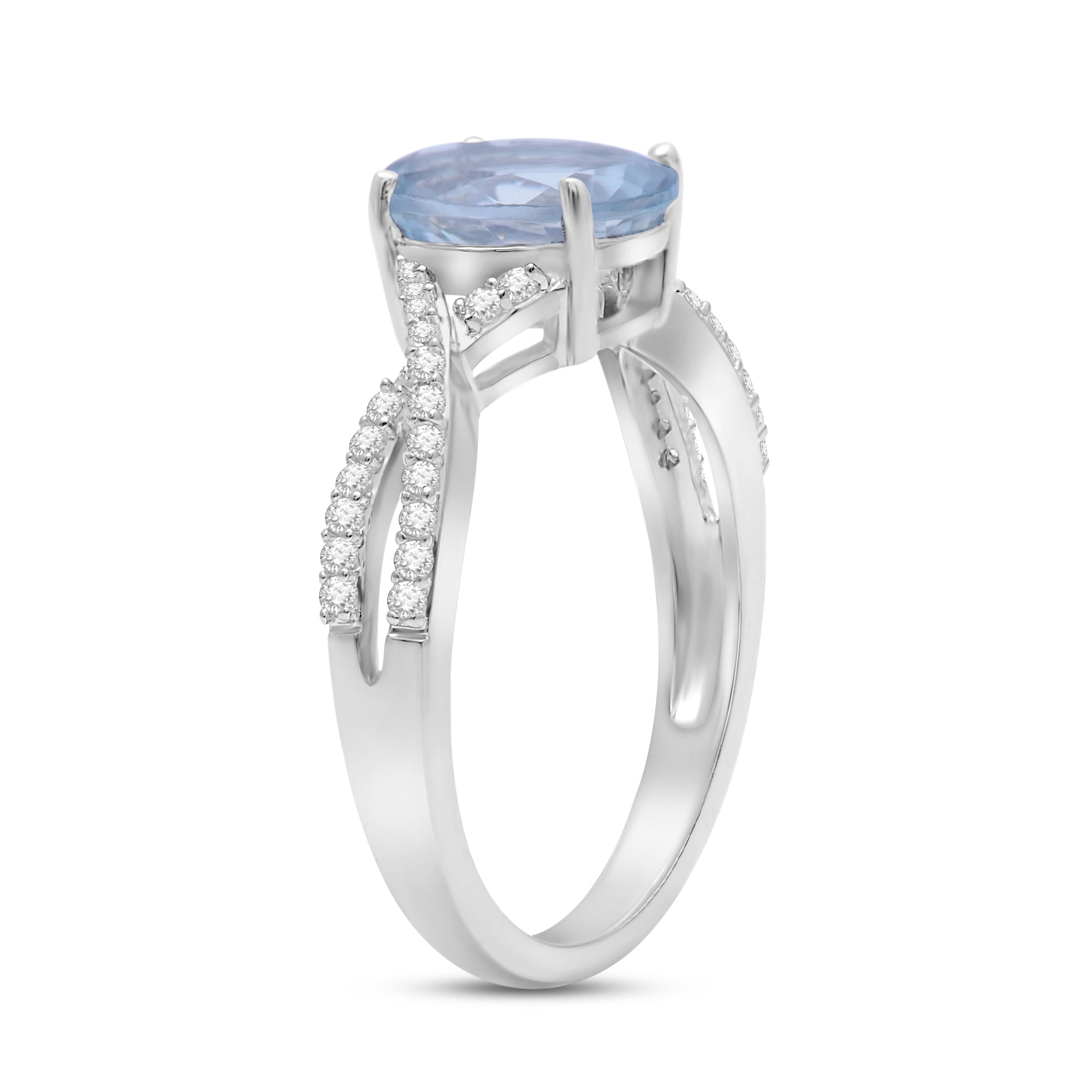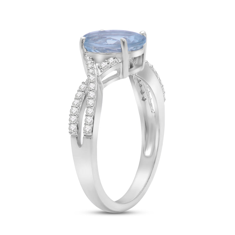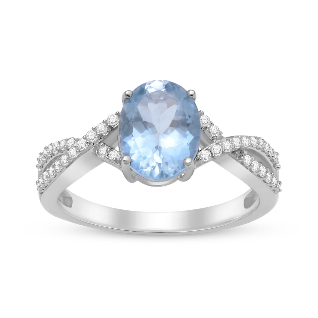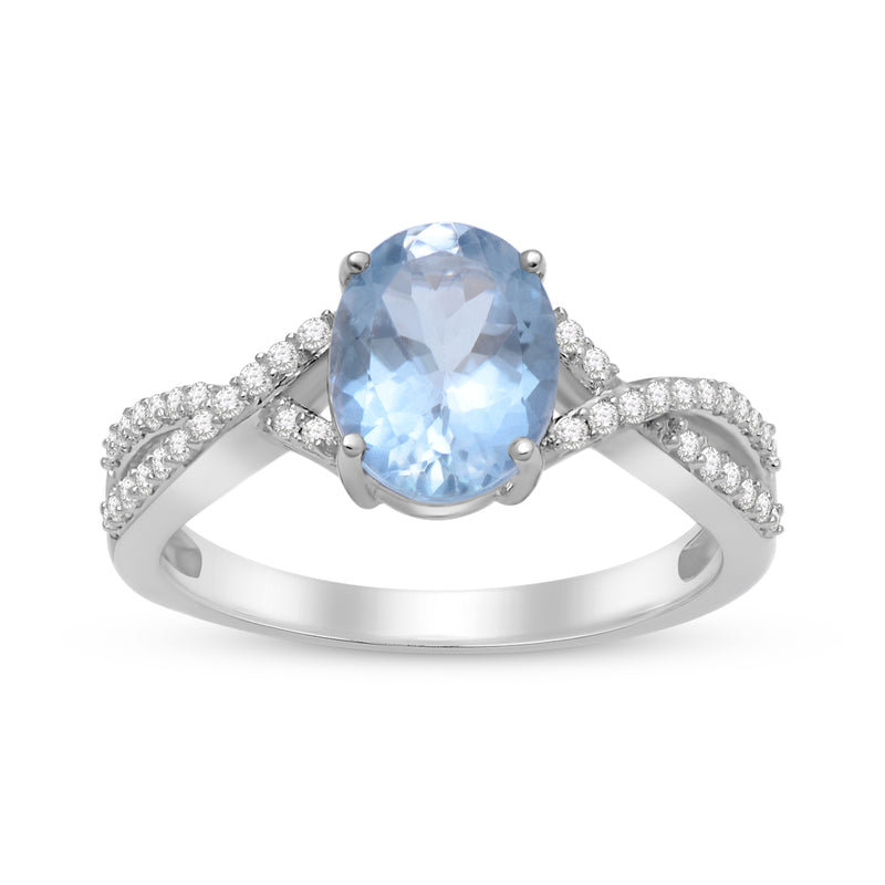 • Attractive engagement ring with aquamarine and round created white sapphires for the bride who is trendy and sophisticated