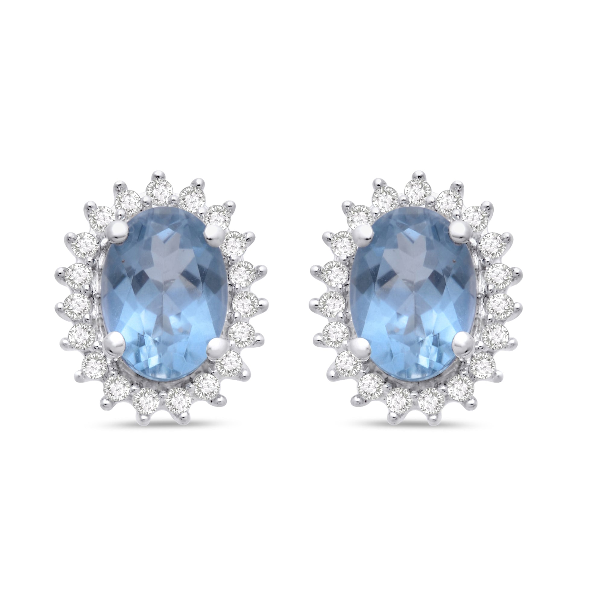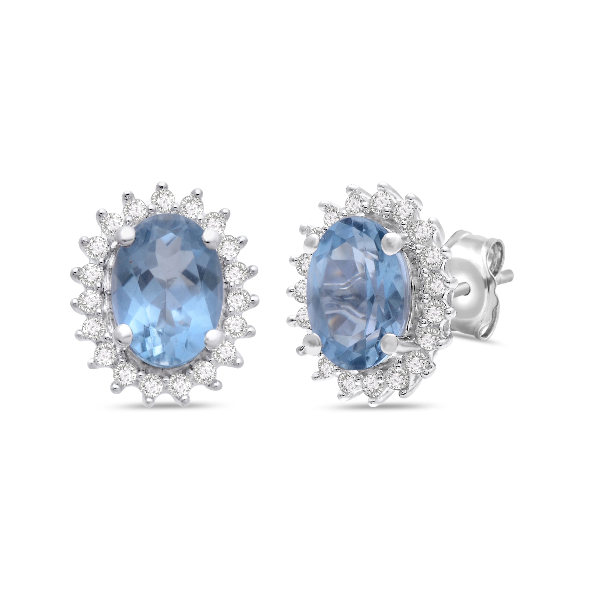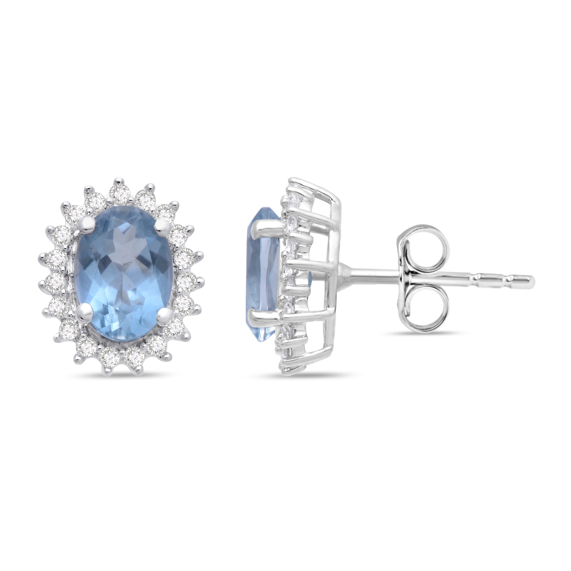 • The translucent beauty of the aquamarine is elevated by round created white sapphires in this pair of stud earrings.