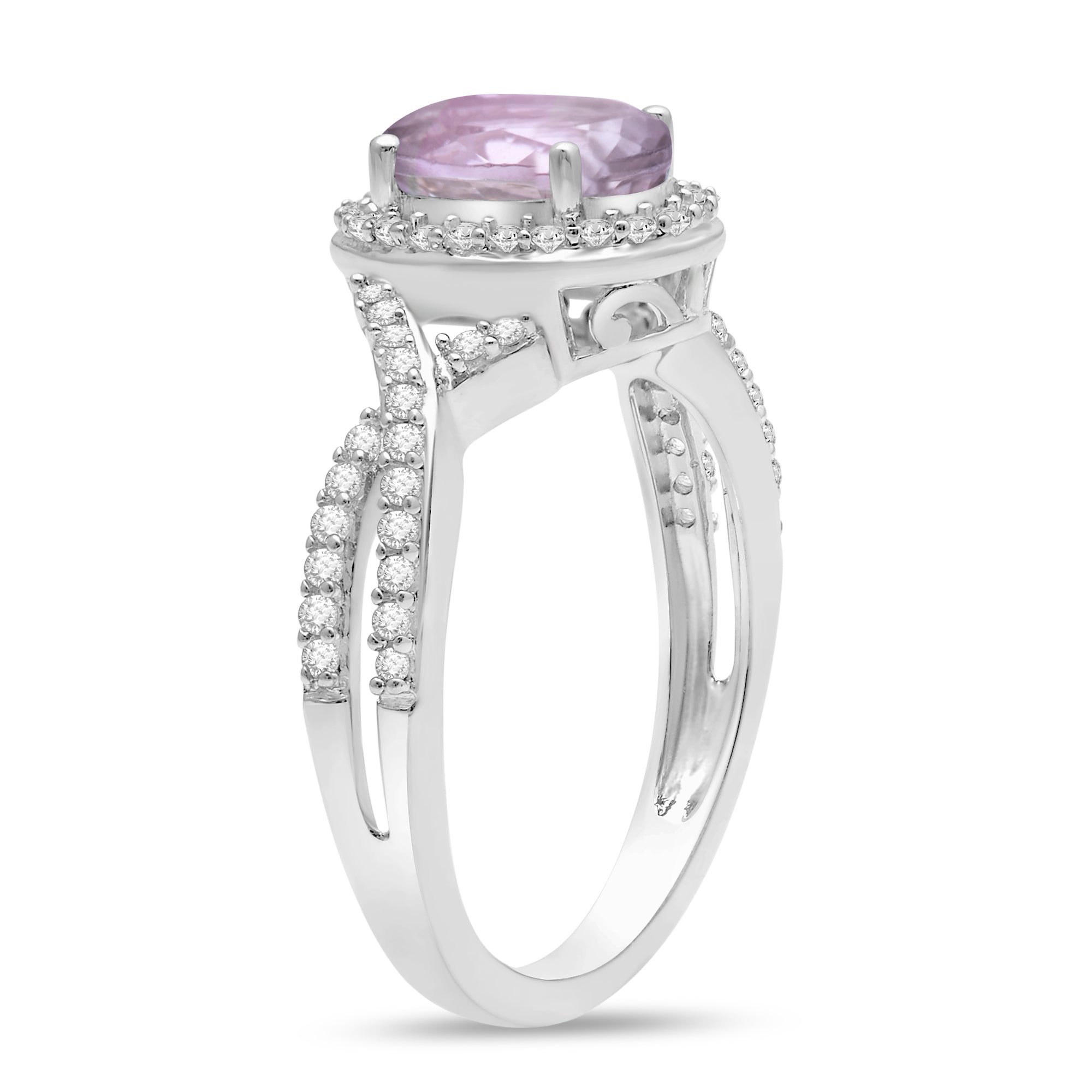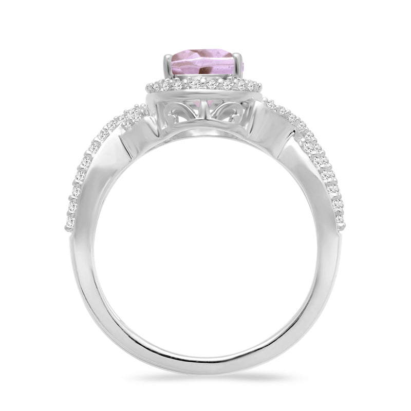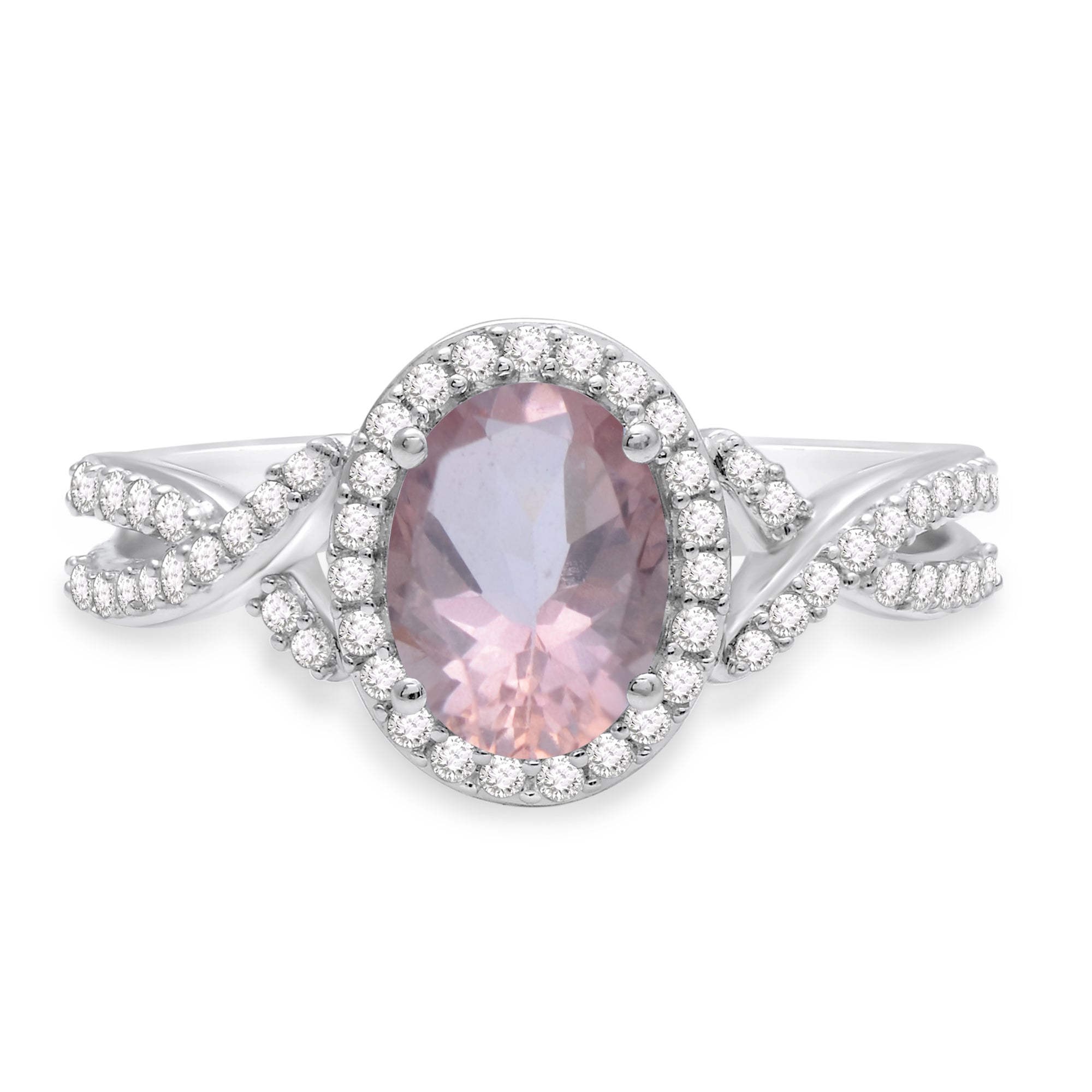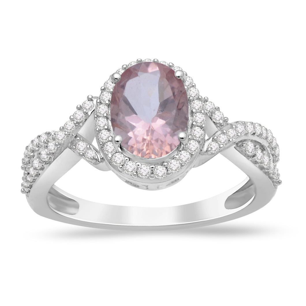 • 8x6 MM oval cut morganite surrounded by a halo and infinity design on the shank makes this engagement ring a beautiful way to ask her to be yours.