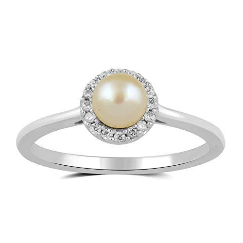 Jewelili Sterling Silver with Round Pearl and Cubic Zirconia Halo Ring