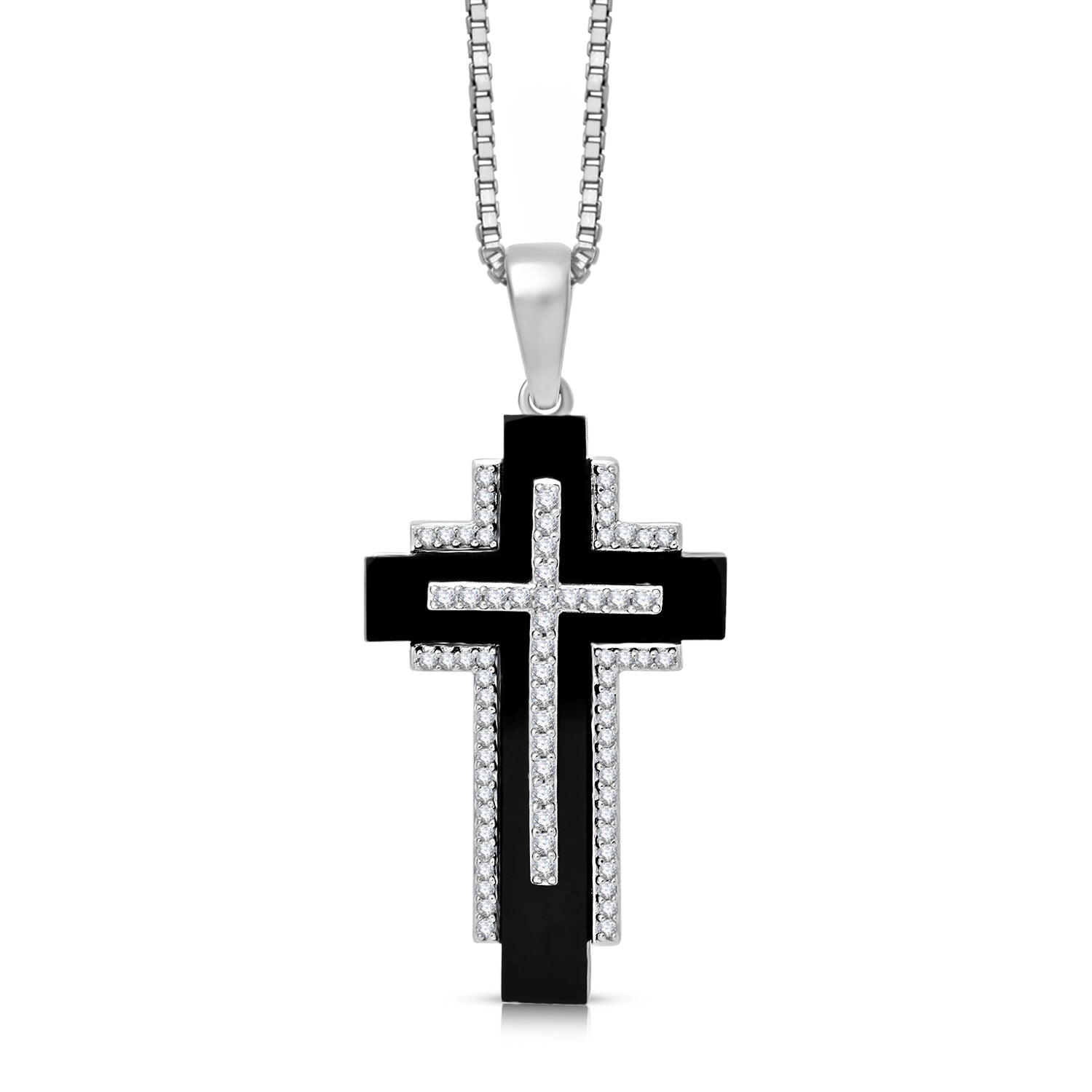 • Cross Pendant Necklace, 22" Box Chain with Sterling Silver 28.0x17.0x4.0  Special Cut Black Onyx and 1/4 Cttw Natural White Round Diamond