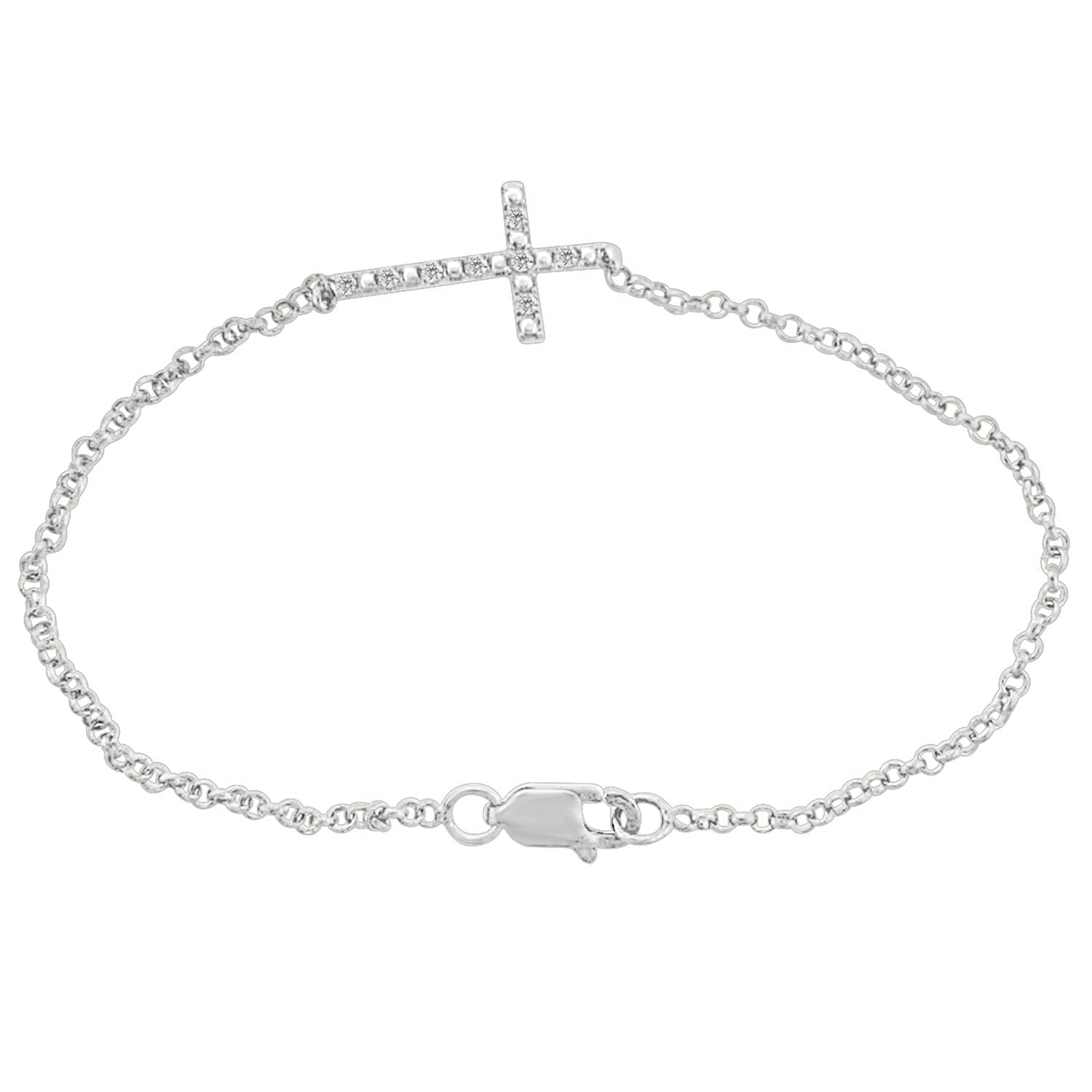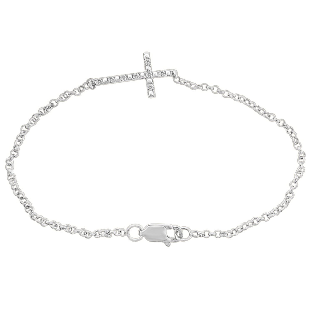 Jewelili Sterling Silver With 1/10 CTTW Natural White Diamond Sideways Cross Bracelet