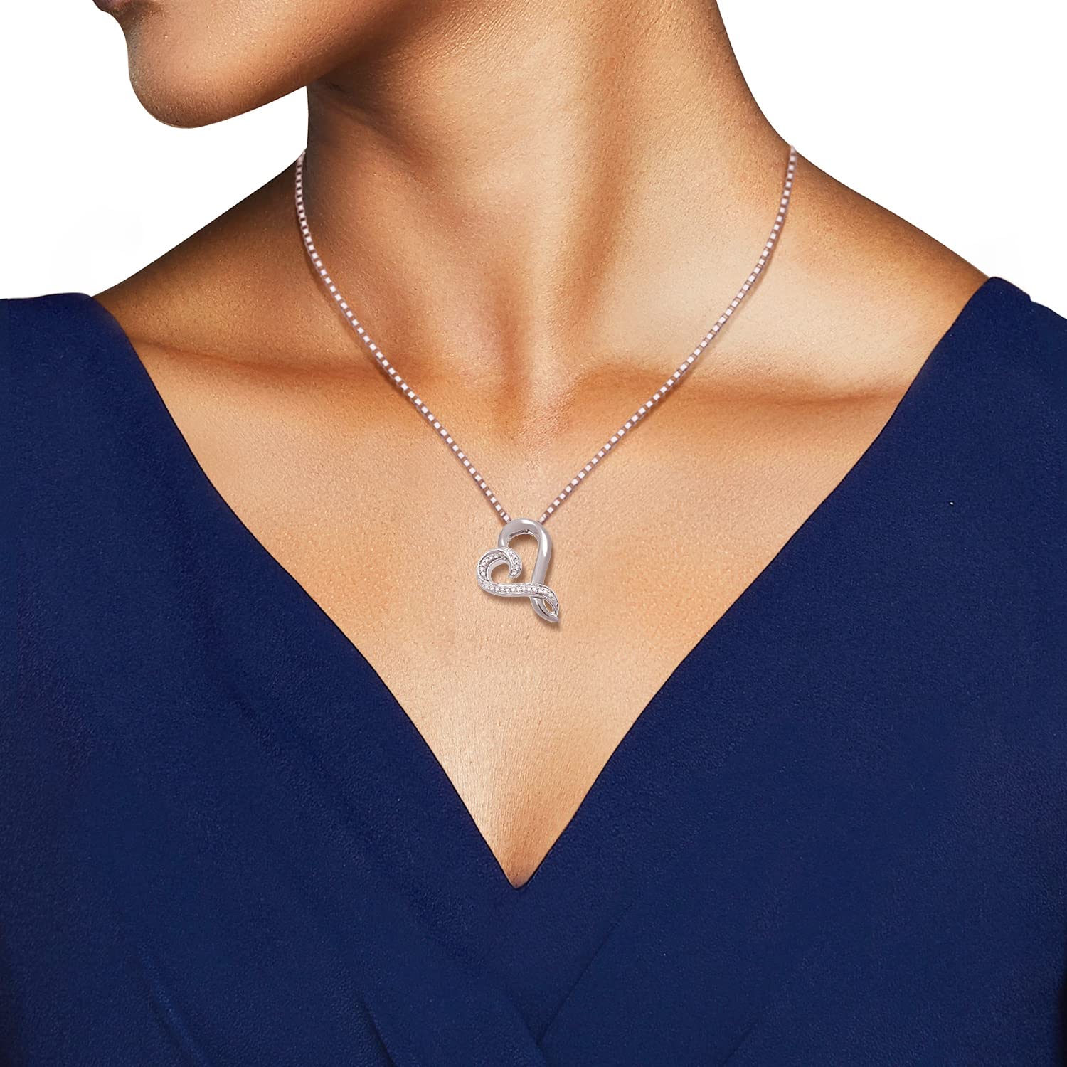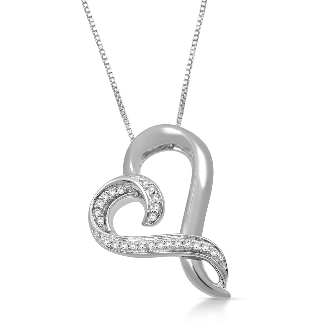 Jewelili Sterling Silver With 1/10 CTTW Natural White Diamond Tilted Heart Pendant Necklace