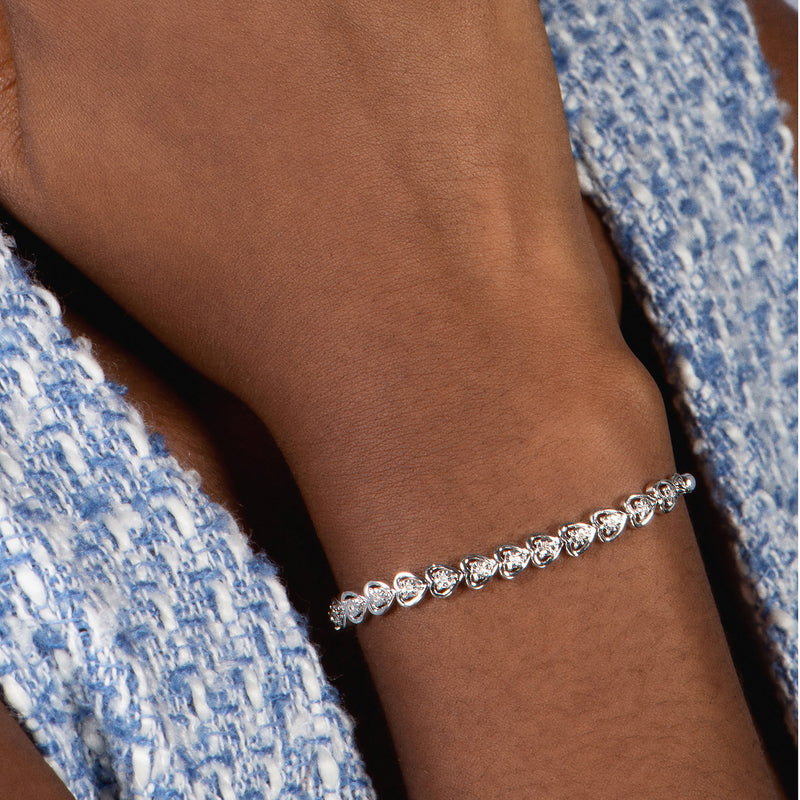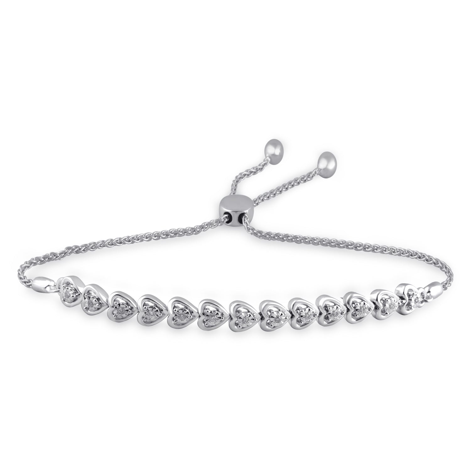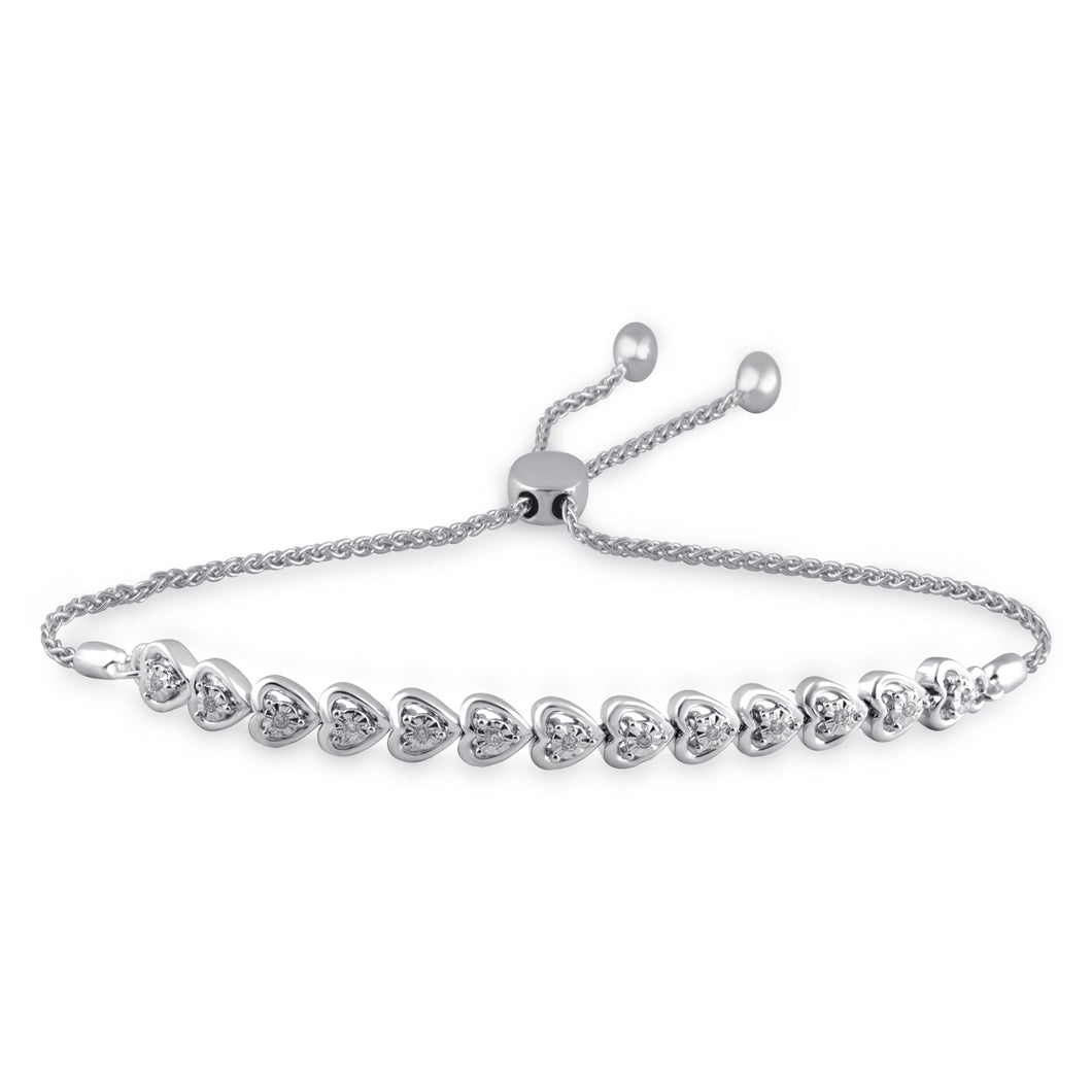 • Wear your heart on your sleeve with this sweet sterling silver and diamond bolo bracelet with baby hearts accented with 1/10cttw sparkling white diamonds.