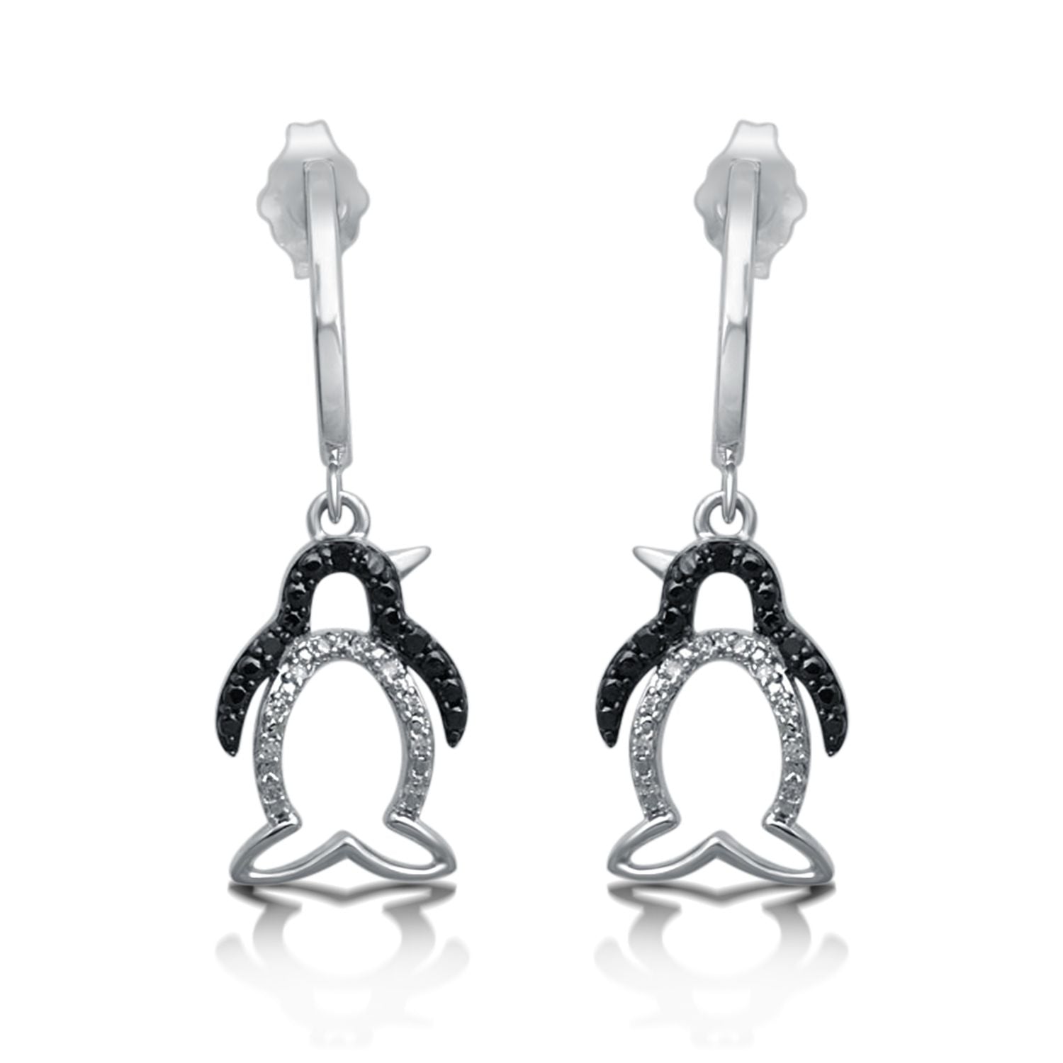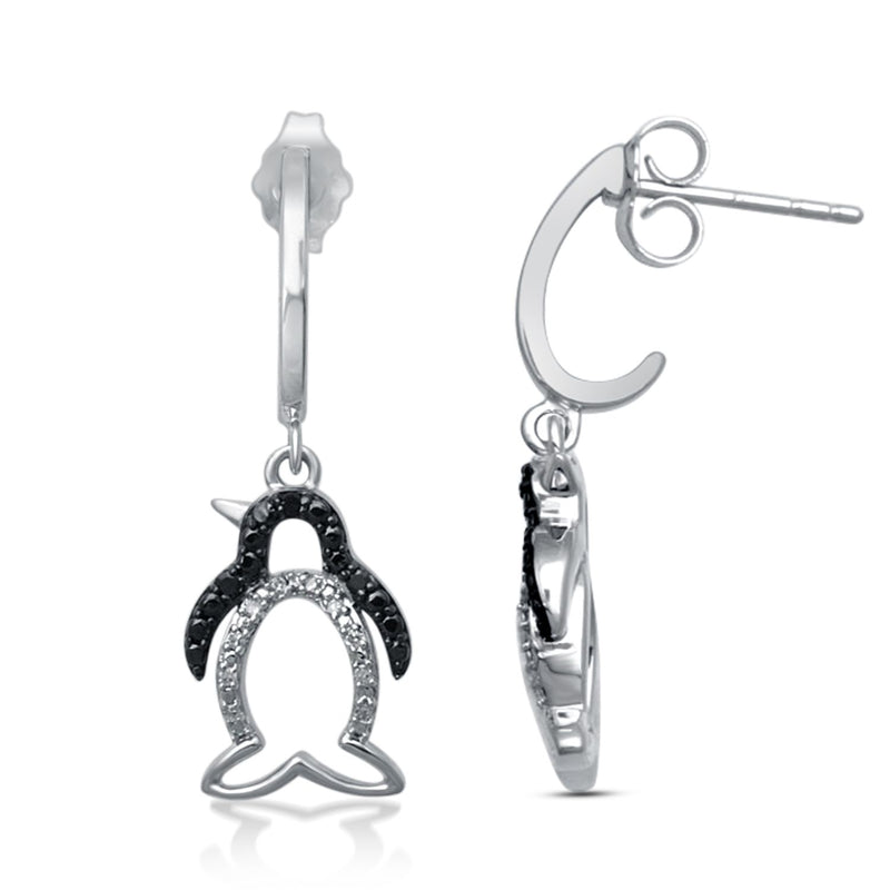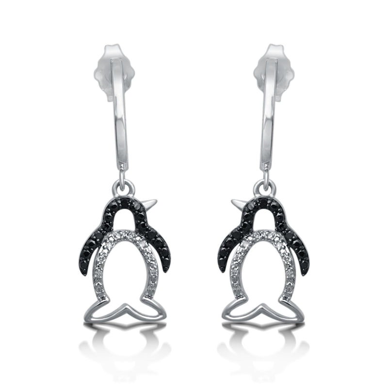 Jewelili Sterling Silver With 1/10 CTTW Treated Black and White Natural Diamonds Penguin Dangle Earrings