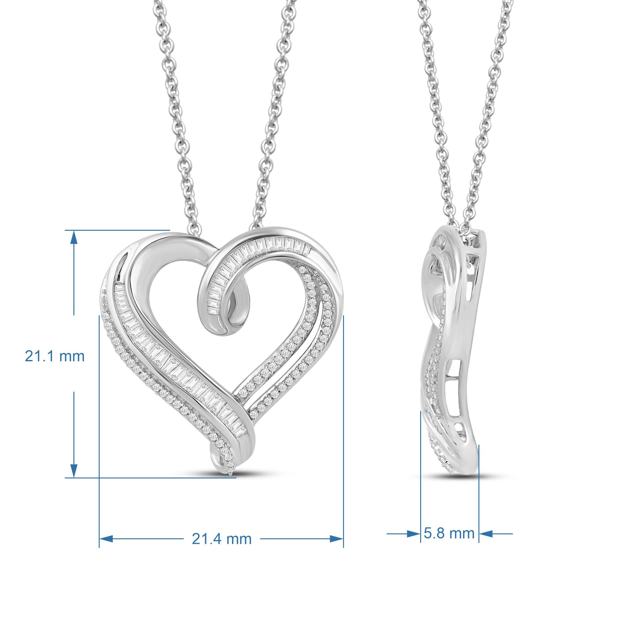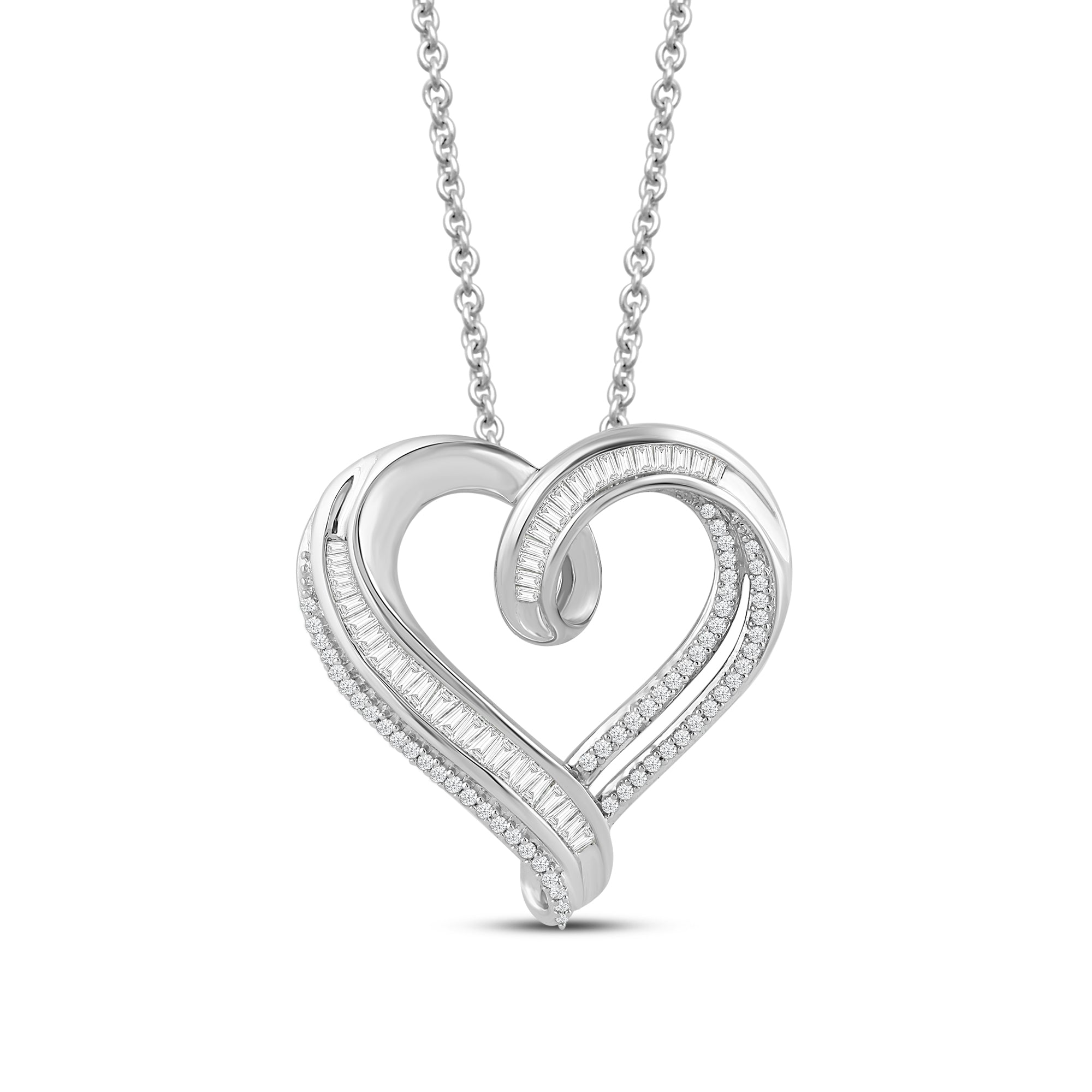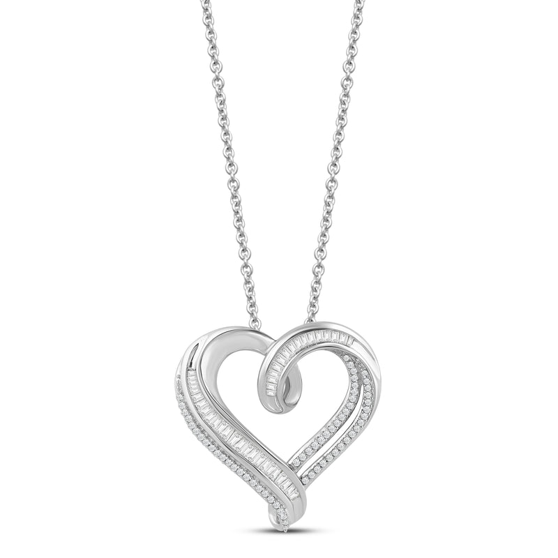 This is a sterling silver heart-shaped pendant necklace with a 1/2 carat total weight of natural white round and baguette cut diamonds. The pendant is attached to an 18-inch cable chain.