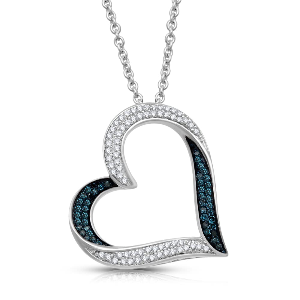 Jewelili Sterling Silver With 1/3 CTTW Treated Blue and Natural White Diamonds Heart Pendant Necklace