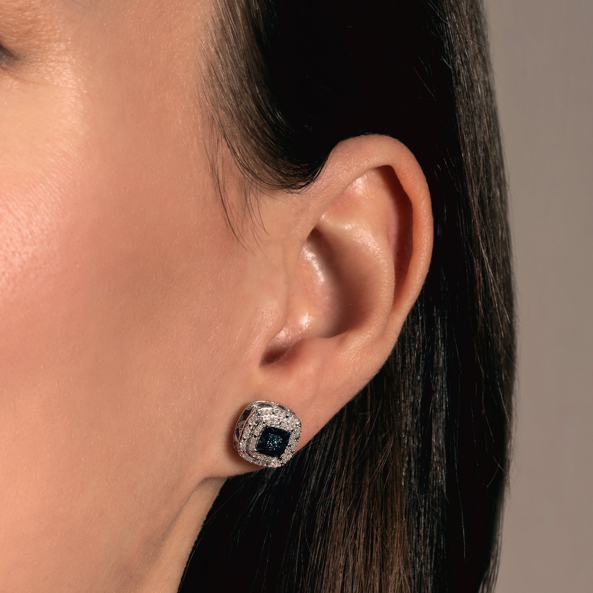 • Load image into Gallery viewer, Jewelili Double Halo Stud Earrings with Treated Blue Diamonds and White Diamonds in Sterling Silver 1/4 CTTW View 4
