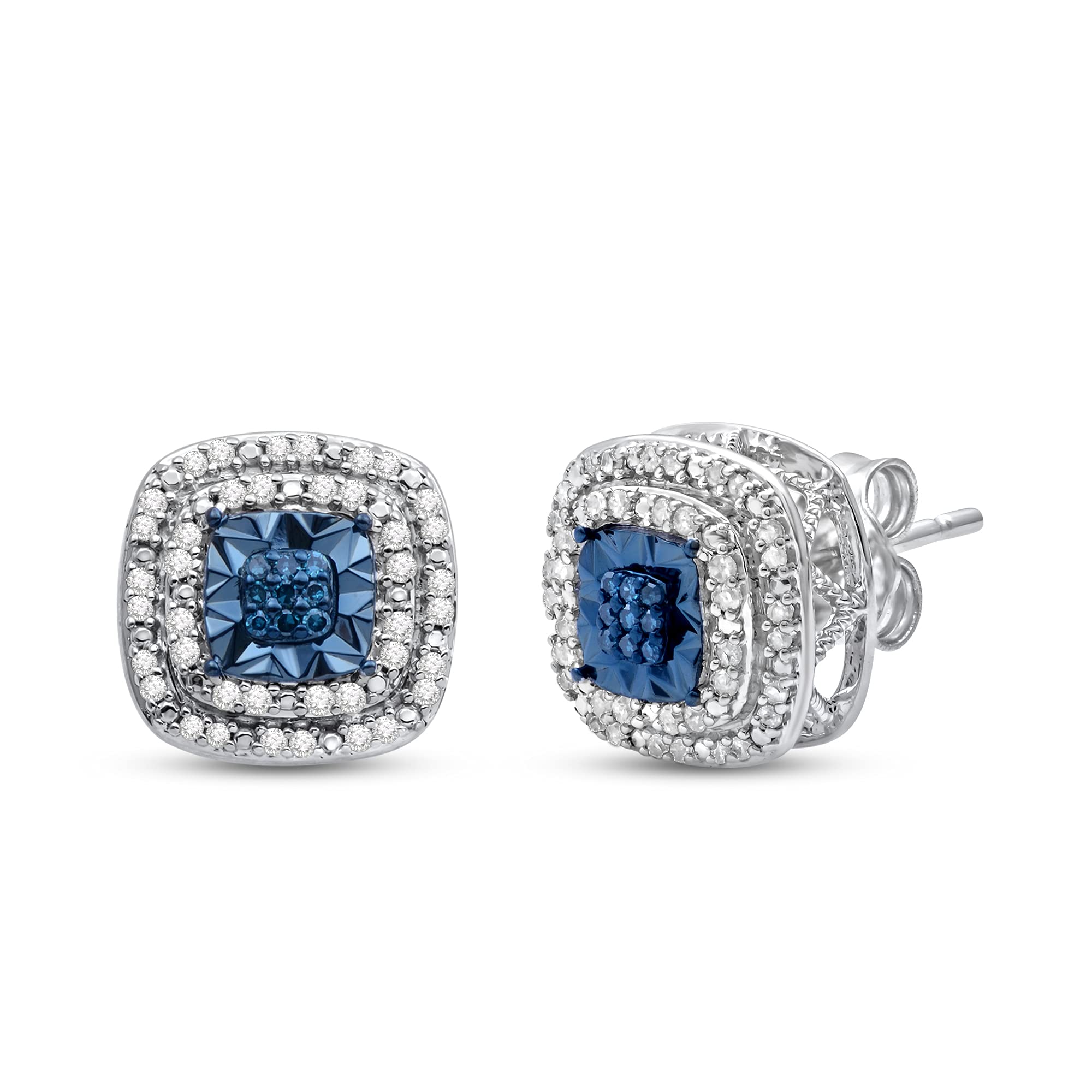 • Sterling Silver With 1/4 Cttw Treated Blue Diamond and White Diamond Double Halo Stud Earrings