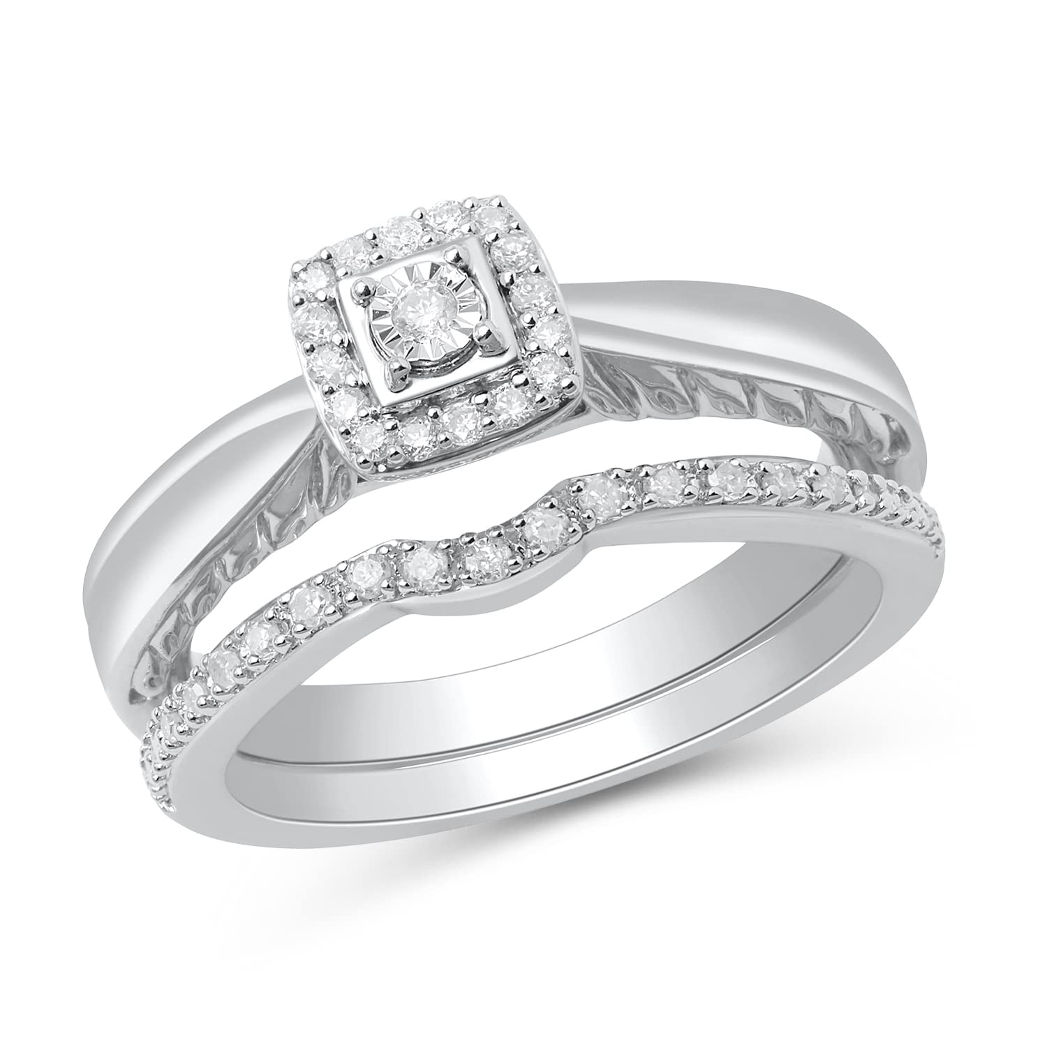 Jewelili Sterling Silver with 1/6 CTTW Natural White Round Diamonds Bridal Set