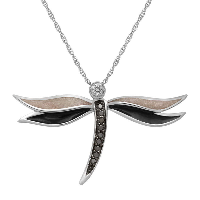Jewelili Sterling Silver with 1/6 CTTW Treated Black and Natural White Diamonds Dragonfly Pendant Necklace