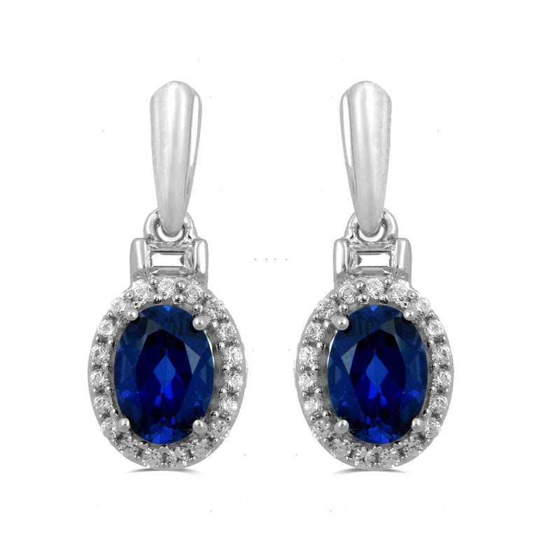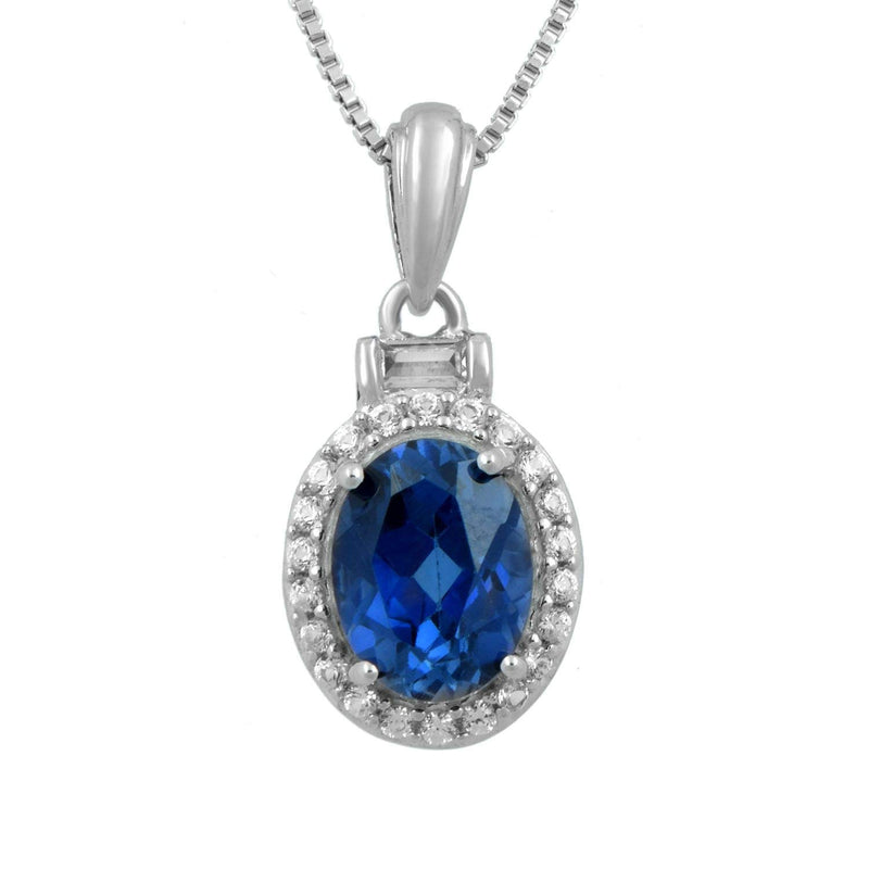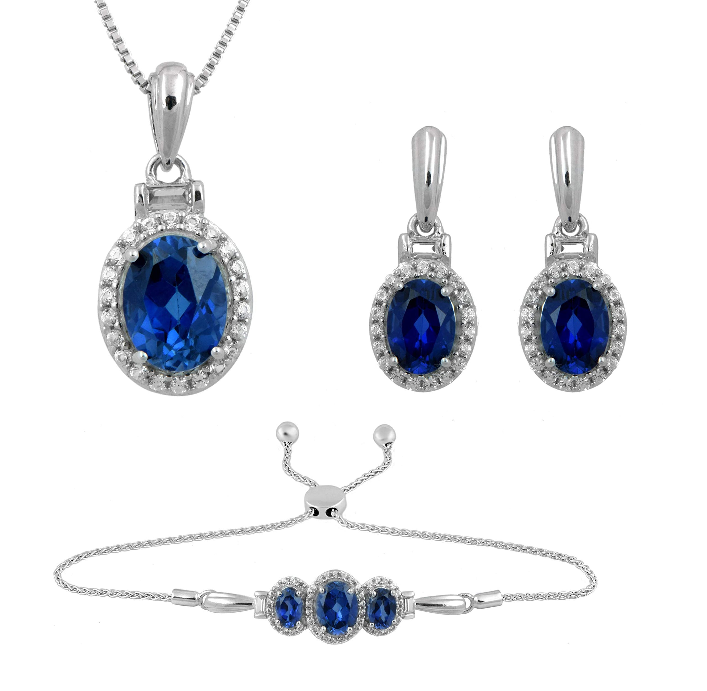 Jewelili Sterling Silver with 8x6MM 7x5MM and 6x5MM Oval Shape Created Ceylon Sapphire with Baguette and Round Created White Sapphire Bolo Bracelet Dangle Earrings and Pendant Necklace, 18" Box Chain