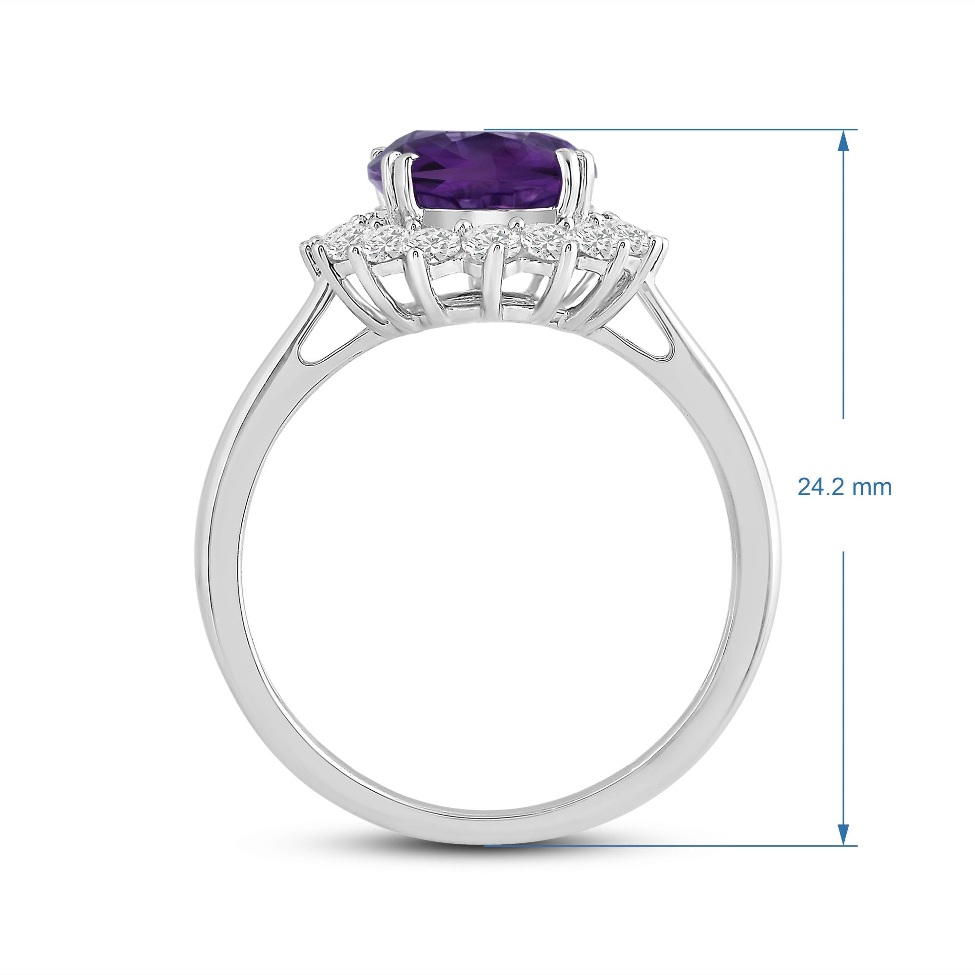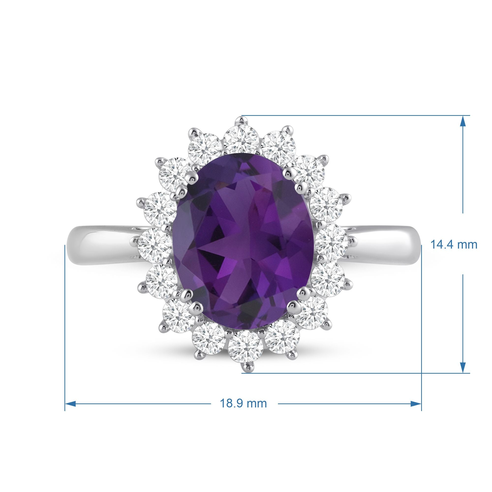This stunning engagement ring boasts a 10x8 millimeter oval created Amethyst as its focal point, surrounded by baguette and round created white sapphires. Made of high-quality sterling silver, this ring is sure to capture attention and make a lasting impression.