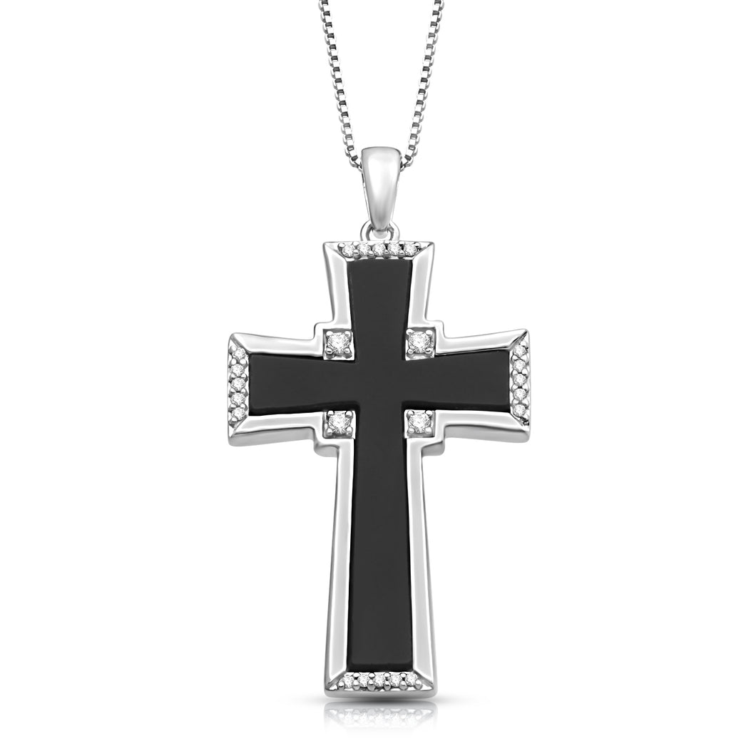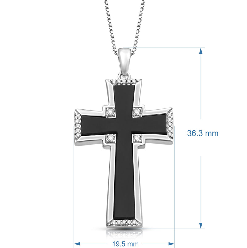 Jewelili Sterling Silver With Black Onyx and 1/10 CTTW Natural White Diamonds Men's Cross Pendant Necklace
