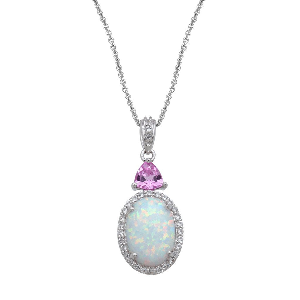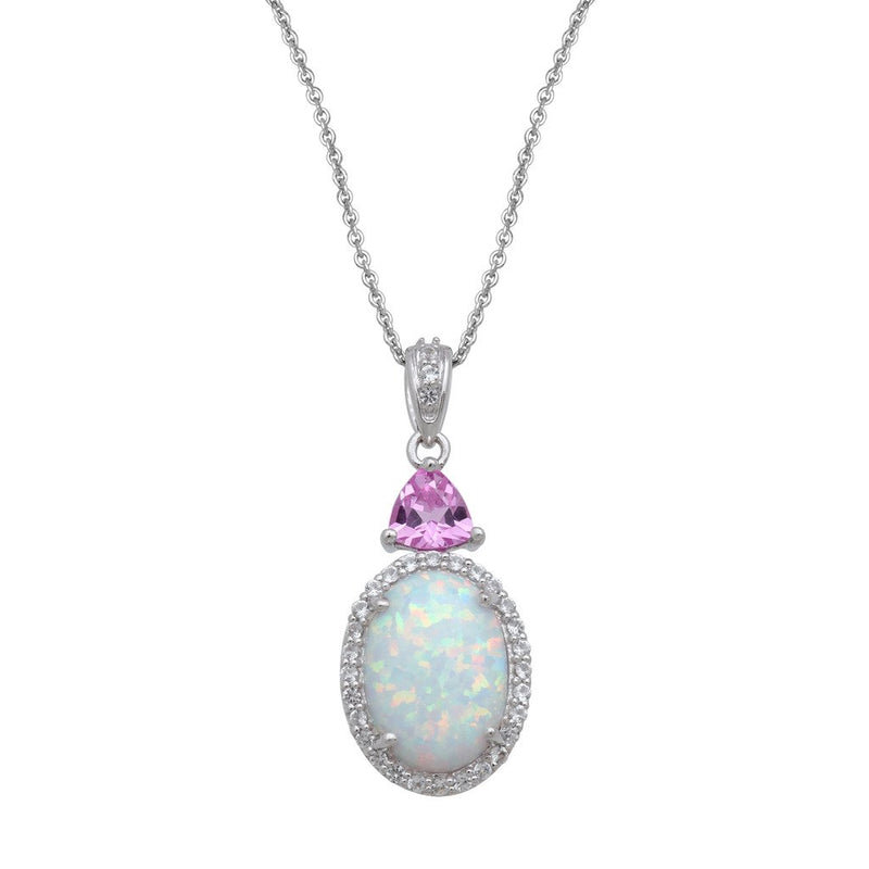 Details: Sterling Silver with Cabochon Oval Created Opal with Trill Created Pink Sapphire and Round Created White Sapphire Pendant Necklace