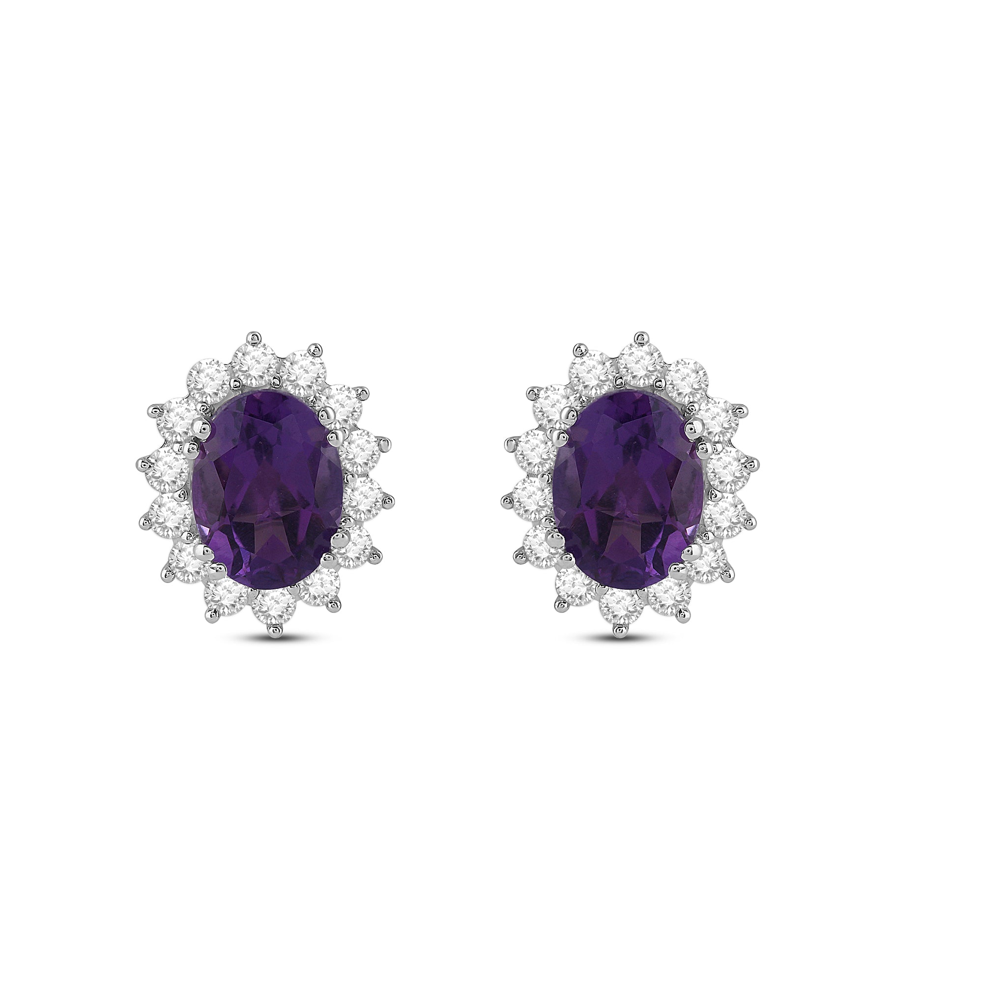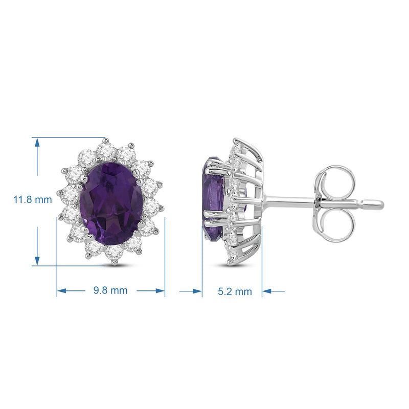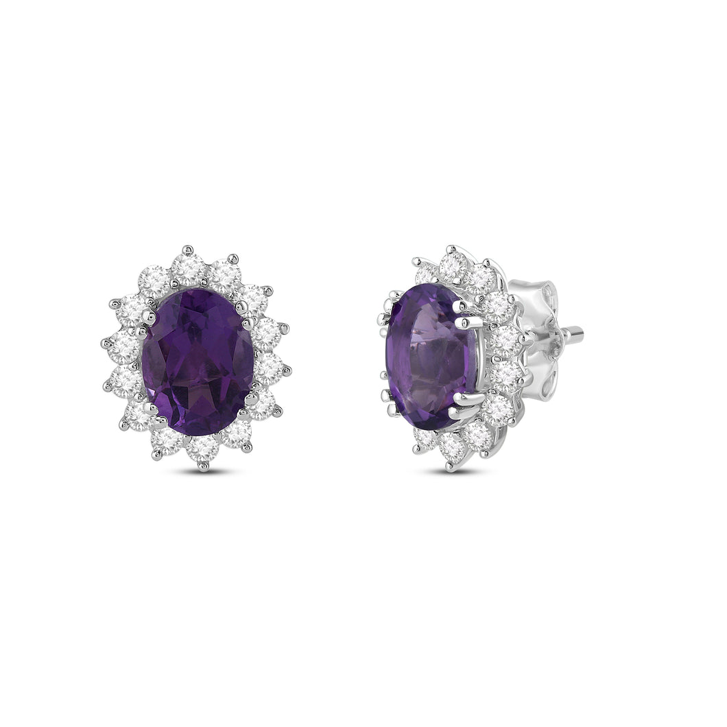 Add a touch of elegance to your look with these gorgeous oval created amethyst and round created white sapphire halo stud earrings. The deep purple of the amethyst is perfectly complemented by the sparkling white sapphires, creating a stunning contrast that will catch the eye of anyone around you. The earrings are carefully crafted to ensure maximum durability and comfort, making them perfect for both formal occasions and everyday wear.