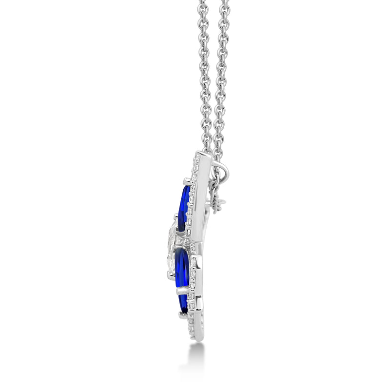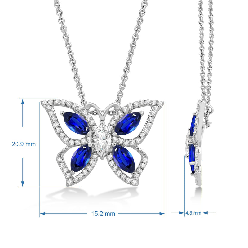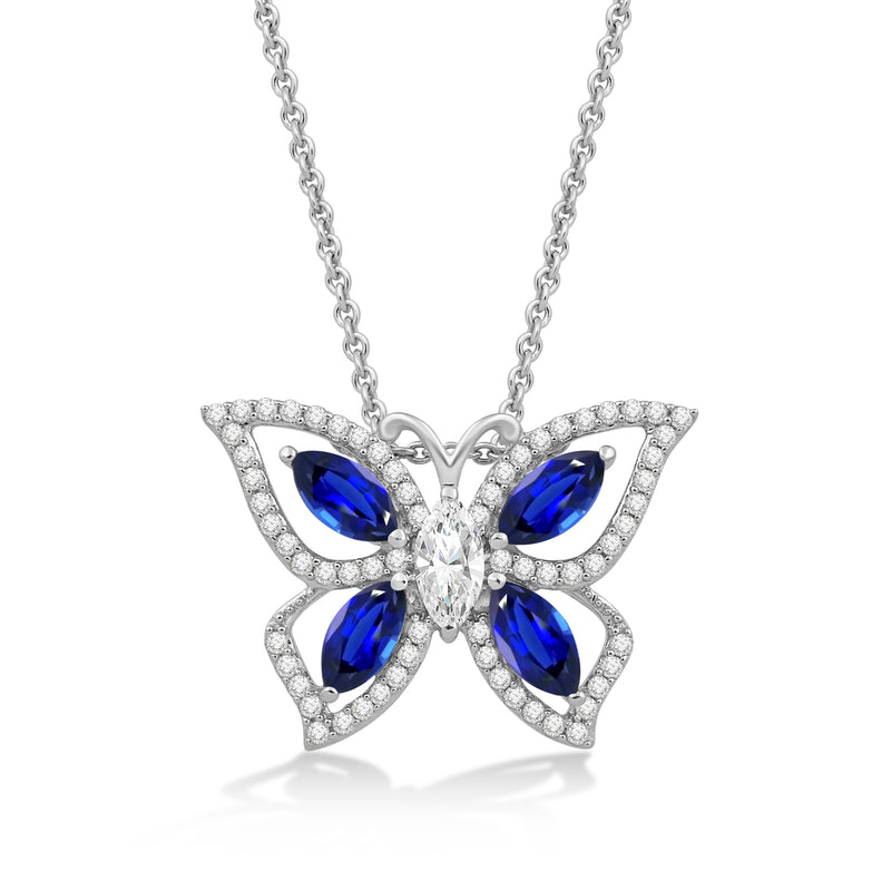 This is a beautiful pendant necklace featuring a butterfly design, made of 6x3 MM marquise created sapphire and marquise and round created white sapphire stones. The pendant hangs from an 18" cable chain and is a perfect gift for someone who loves nature-inspired jewelry.