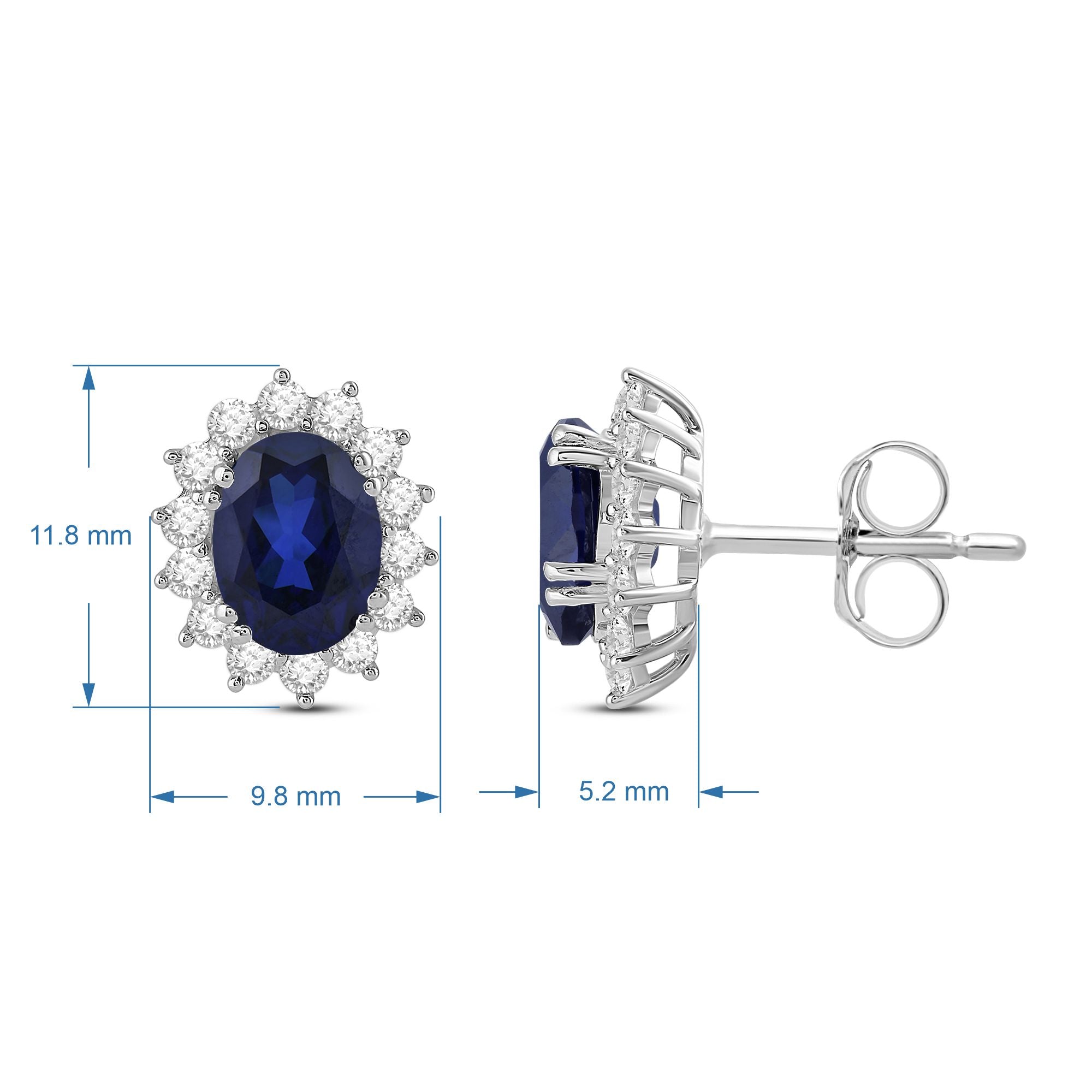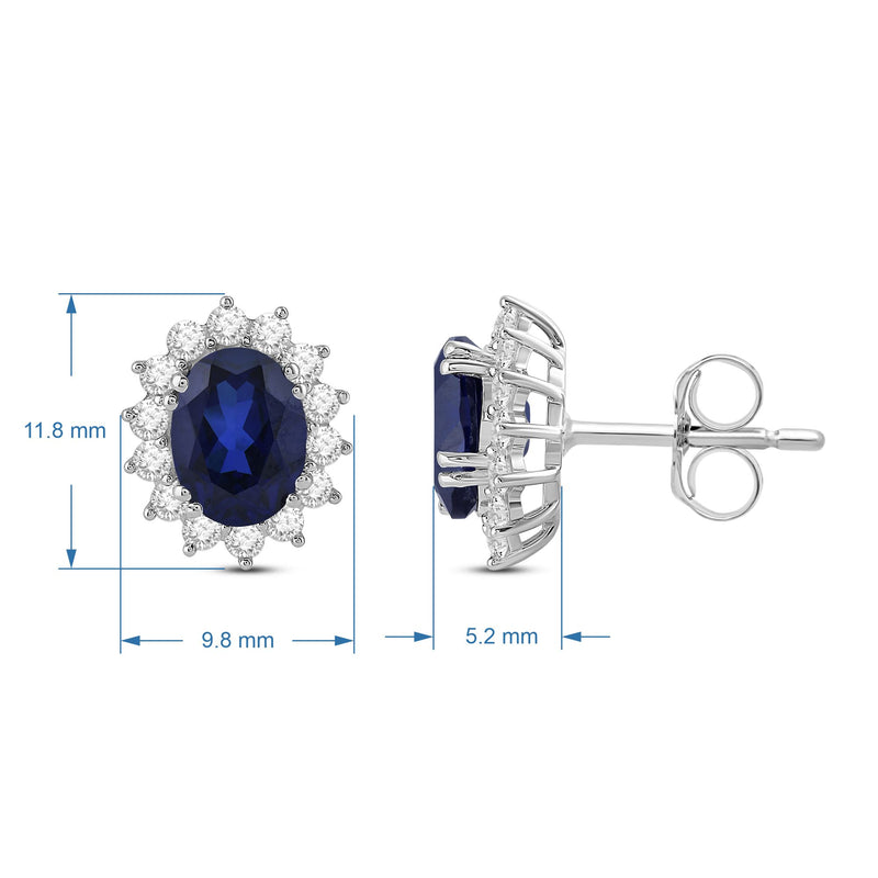 These stunning stud earrings feature an oval-shaped, created blue sapphire at their center, surrounded by a halo of sparkling, round-cut, created white sapphires. The earrings are crafted from high-quality materials and are perfect for adding a touch of elegance to any outfit. With their classic design and timeless beauty, they make an excellent choice for a special occasion or as a gift for someone special.