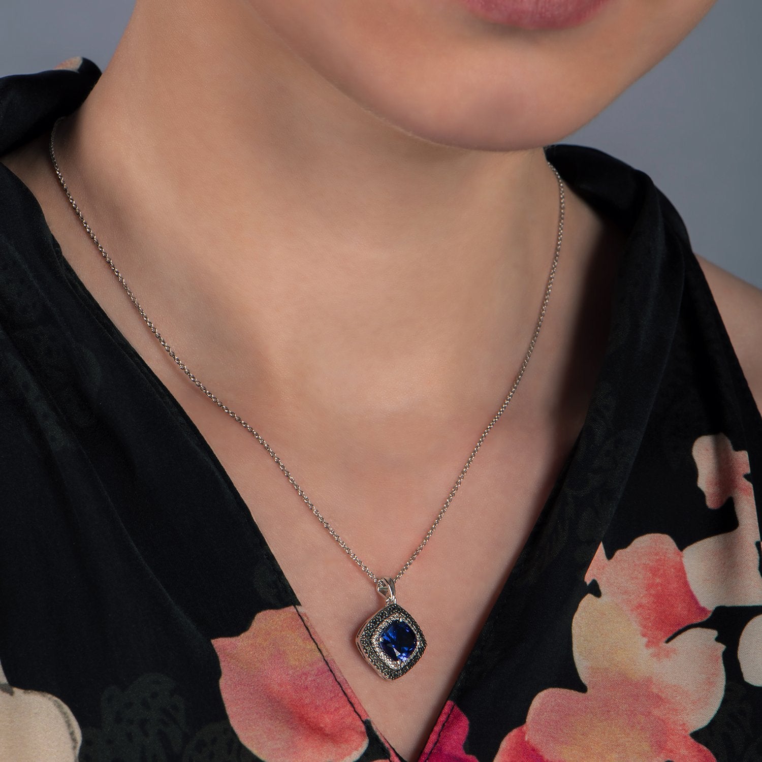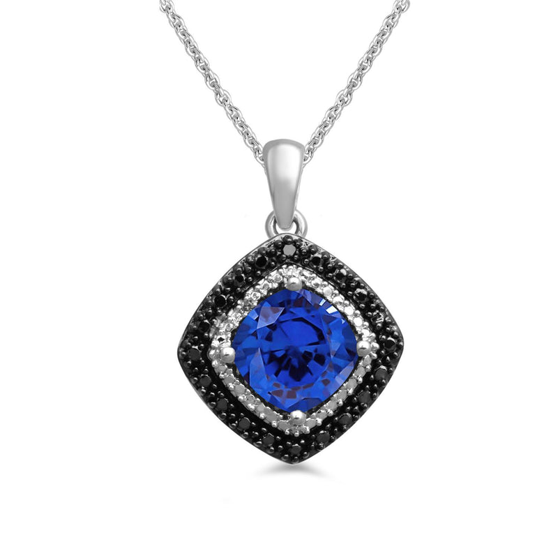 • Sterling Silver with Created Blue Sapphire and Treated Black and Natural White Round Diamond Accents Pendant Necklace