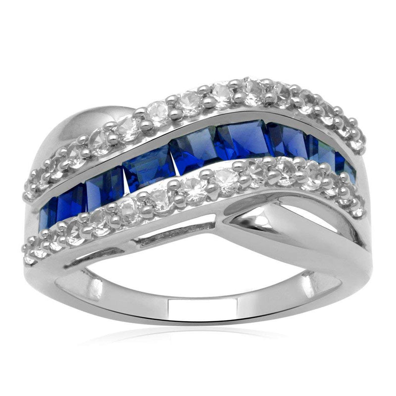 Jewelili Sterling Silver with Created Ceylon Sapphire and Created White Sapphire Ring