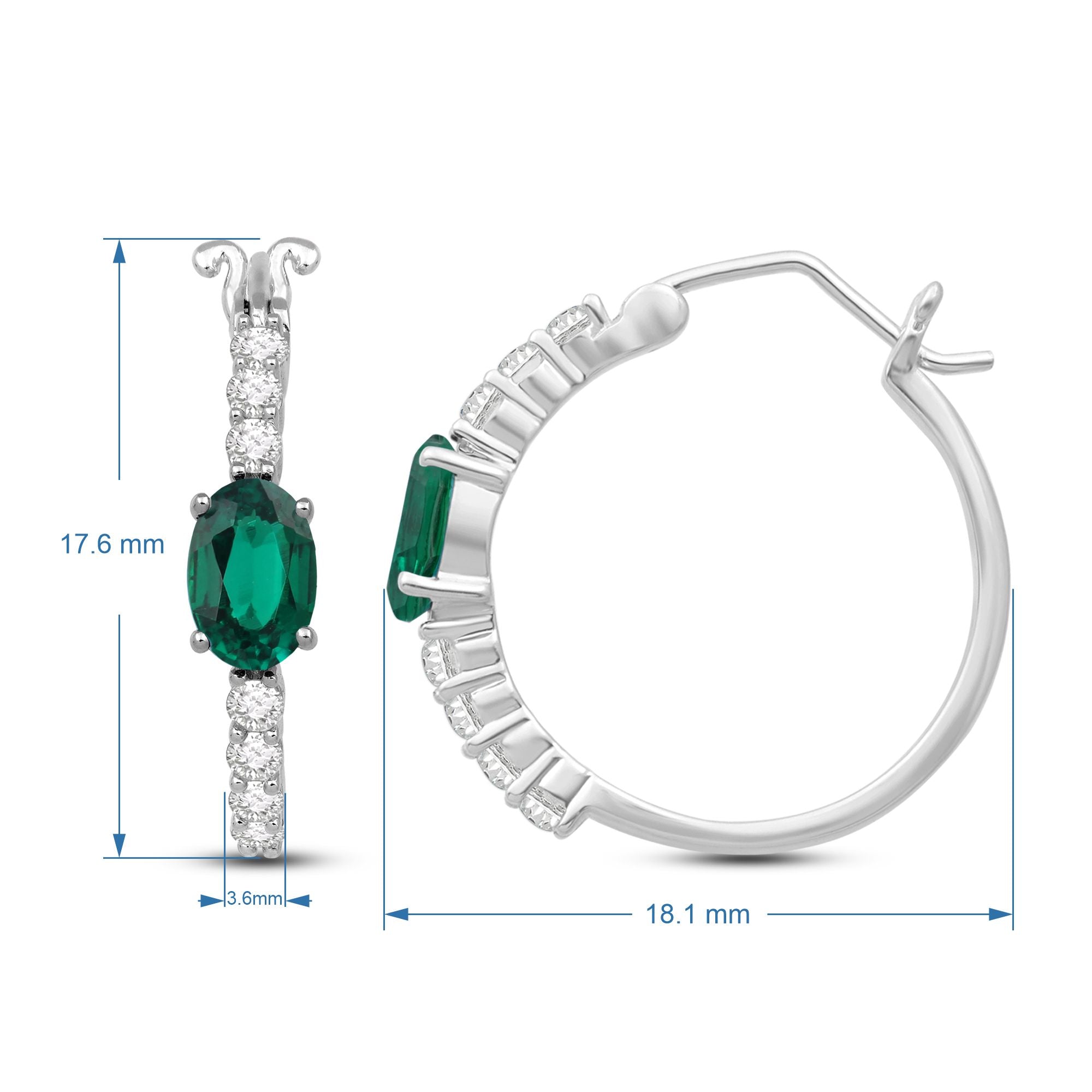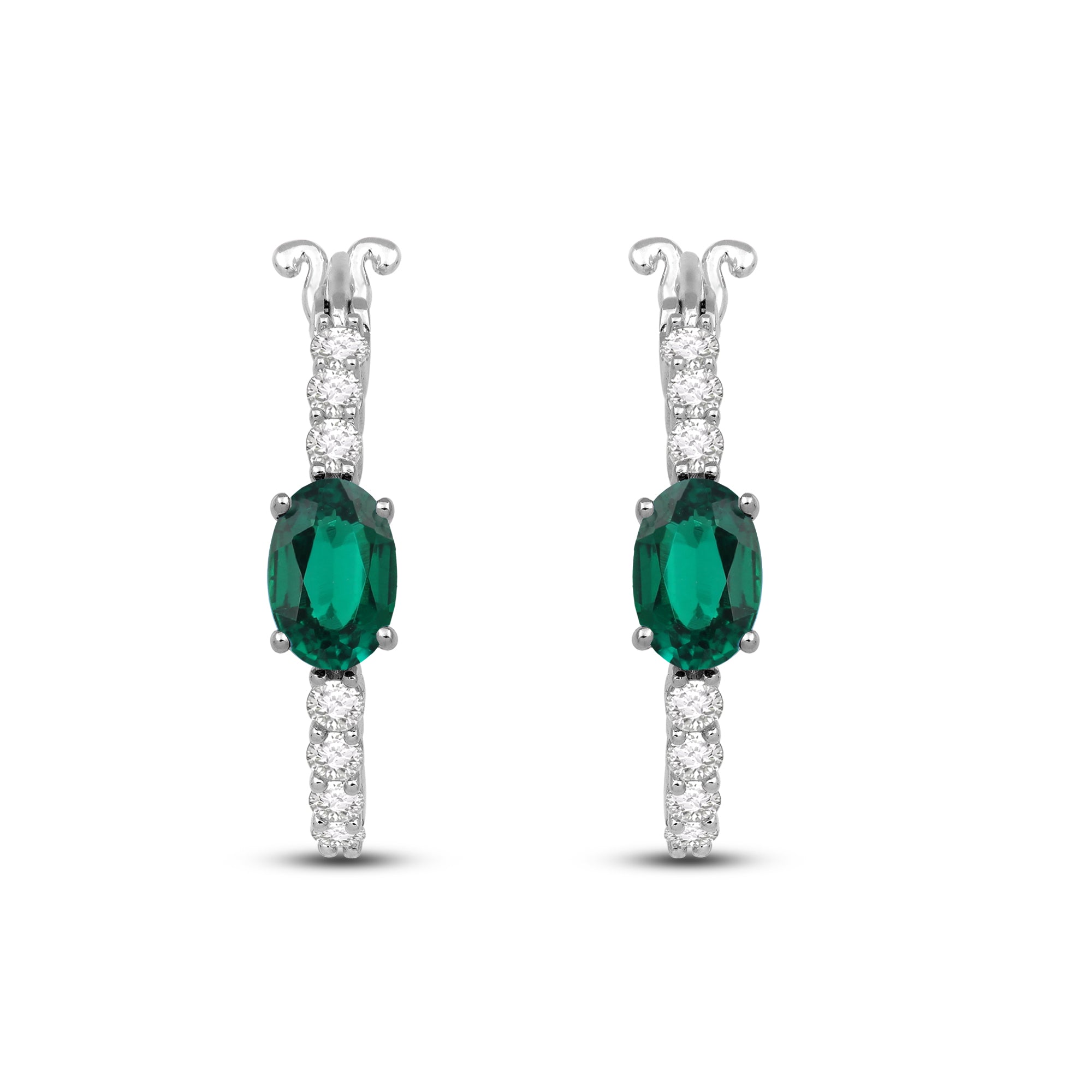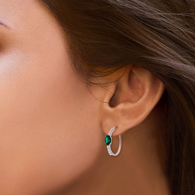 These hoop earrings are made of high-quality sterling silver and feature two types of lab-created gemstones. The main stone is an oval-shaped emerald with a vibrant green color that catches the light beautifully. Surrounding the emerald are several smaller, round white sapphires that add a sparkling contrast. The hoops themselves are a classic design, comfortable to wear and secure with a hinge closure. These earrings are a perfect choice for anyone looking for a stylish and affordable accessory to add to their jewelry collection.