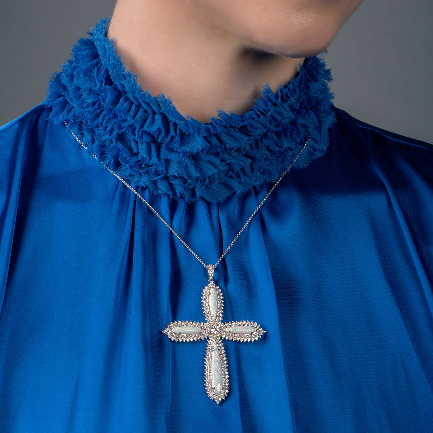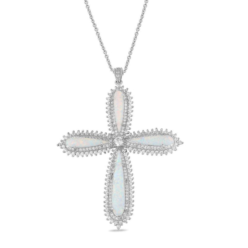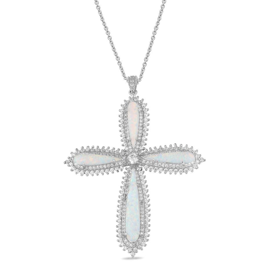 Details: Sterling Silver with Created Opal and Cubic Zirconia Cross Pendant Necklace