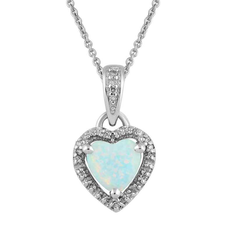 Details: Sterling Silver With Created Opal and Natural White Diamonds Halo Heart Pendant Necklace