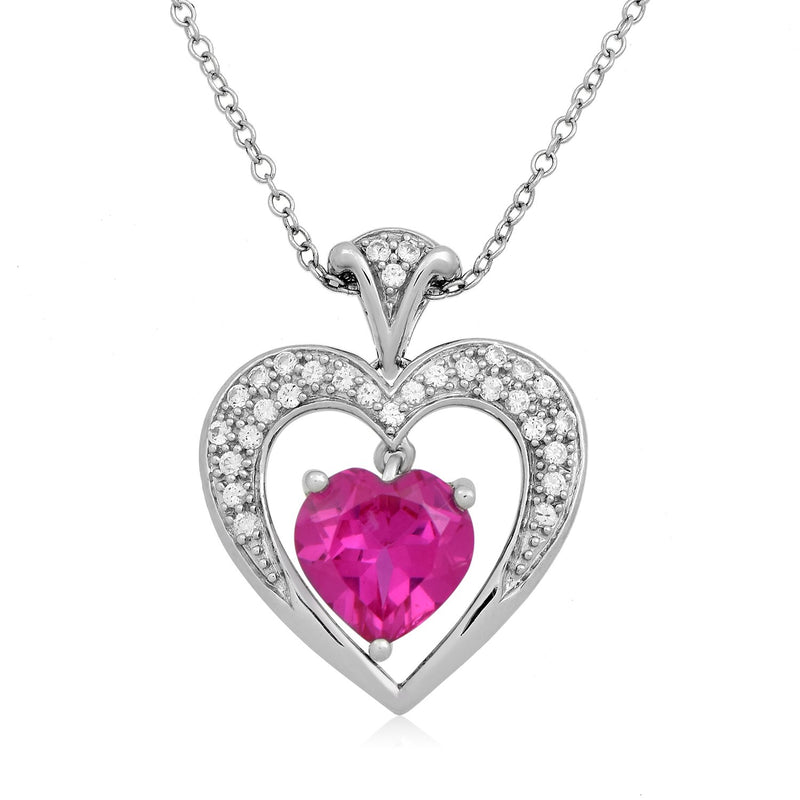Jewelili Sterling Silver with Created Pink Sapphire and Created White Sapphire Heart Pendant Necklace