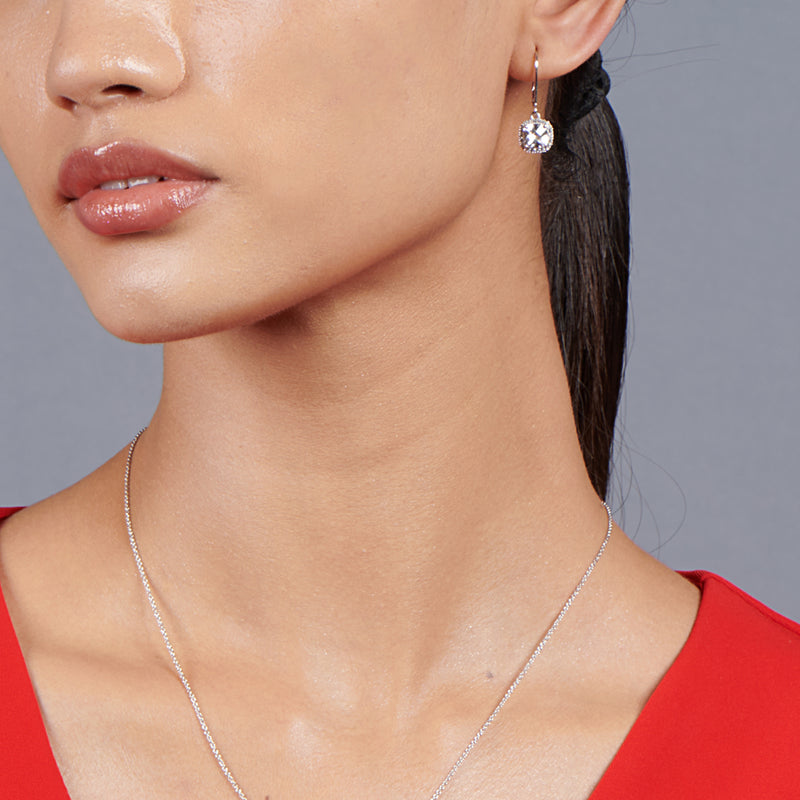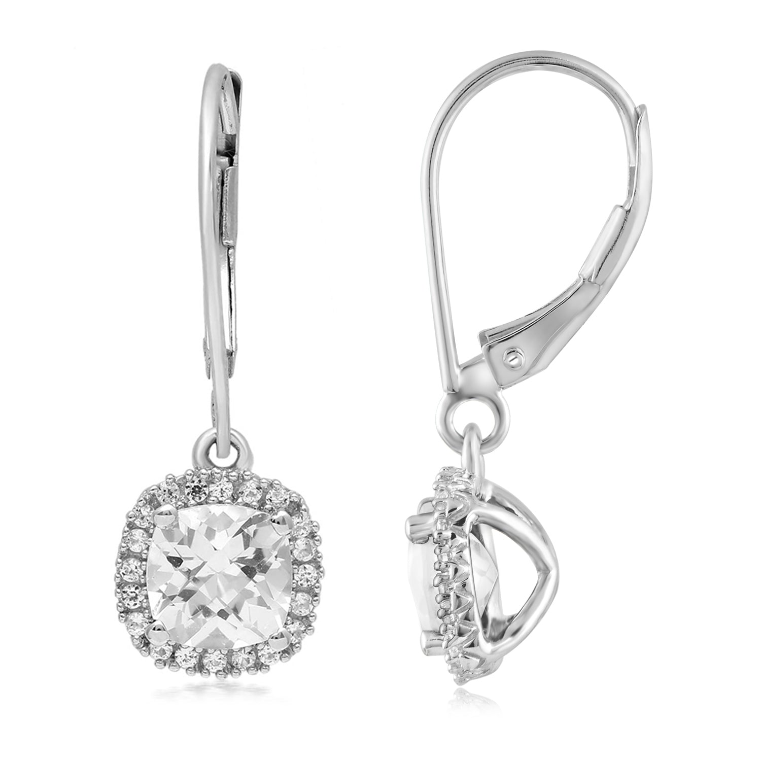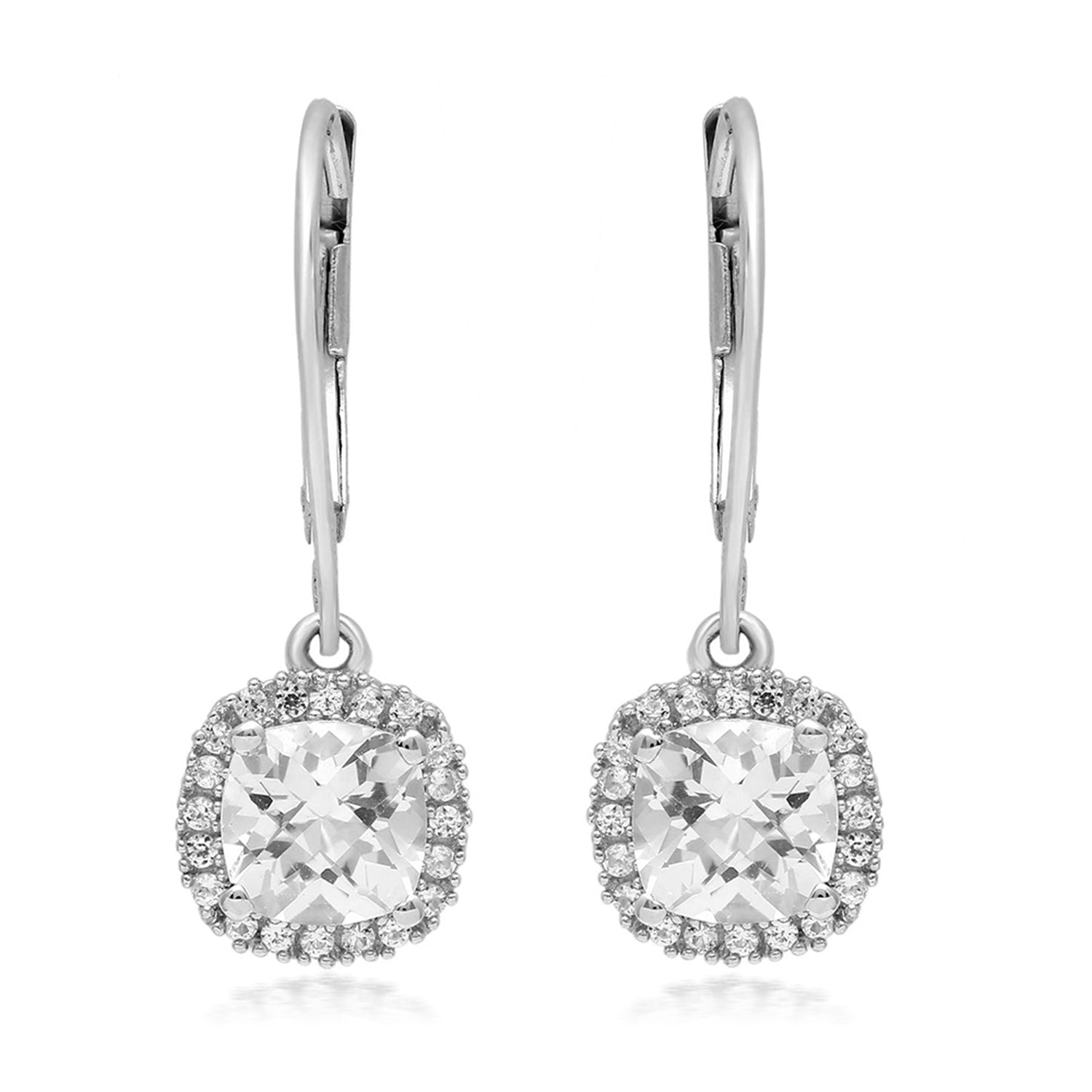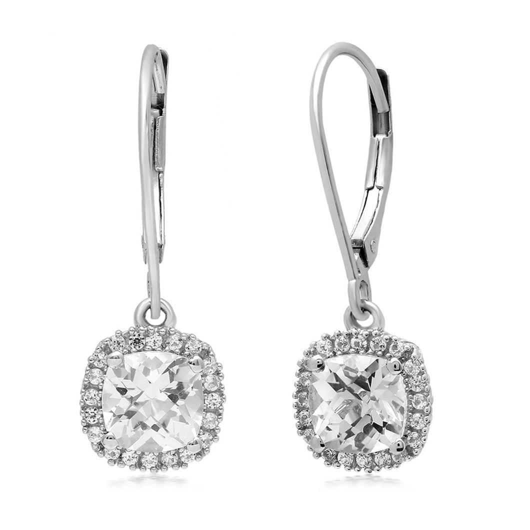 • Leverback Dangle Sterling Silver Earrings featuring 6mm Checkerboard Cushion Shape Created White Sapphire enhanced with 1mm Round Created White Sapphire. Secured with Leverback Closures