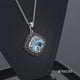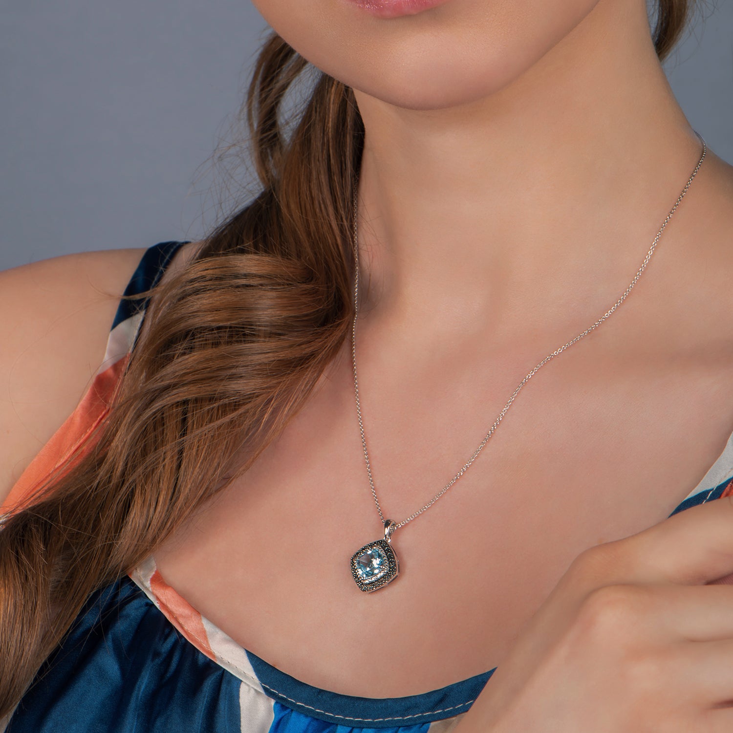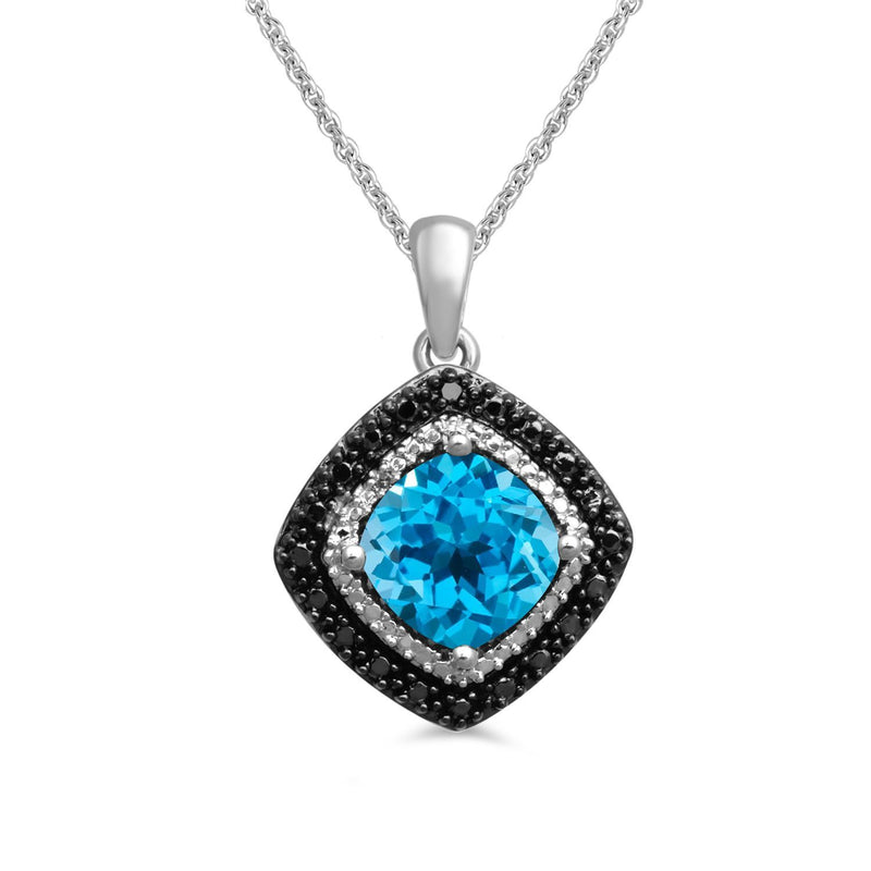 • Sterling Silver with Cushion Shape Sky Blue Topaz and Treated Black and Natural White Round Diamond Accents Pendant Necklace