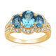 • Sterling Silver Gold Plated Three Stone Ring Featuring Oval Blue Topaz in the center surrounded with created White Sapphire