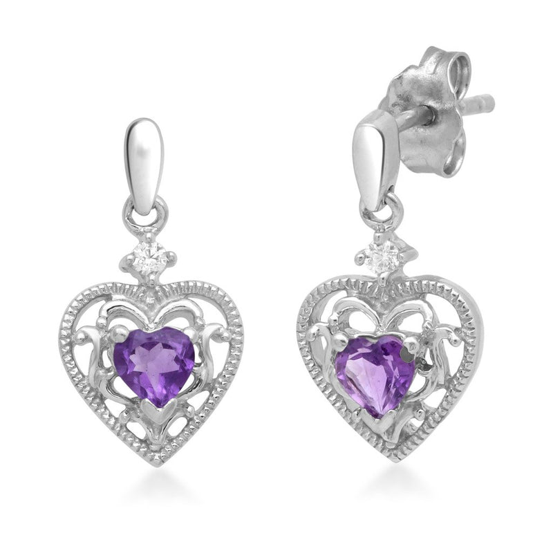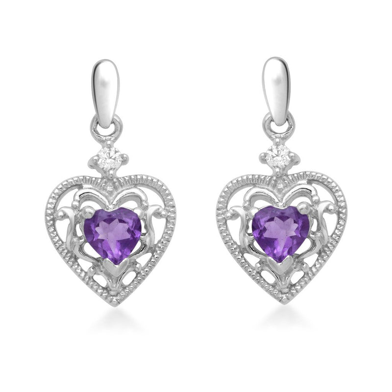 • Sterling Silver with Heart Amethyst and White Cubic Zirconia Filigree Dangle Earrings