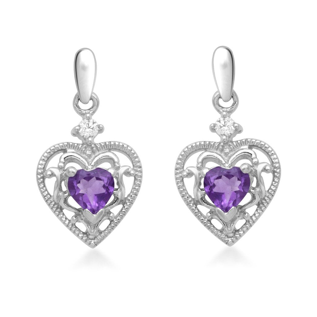 Jewelili Sterling Silver with Heart Amethyst and White Cubic Zirconia Filigree Dangle Earrings
