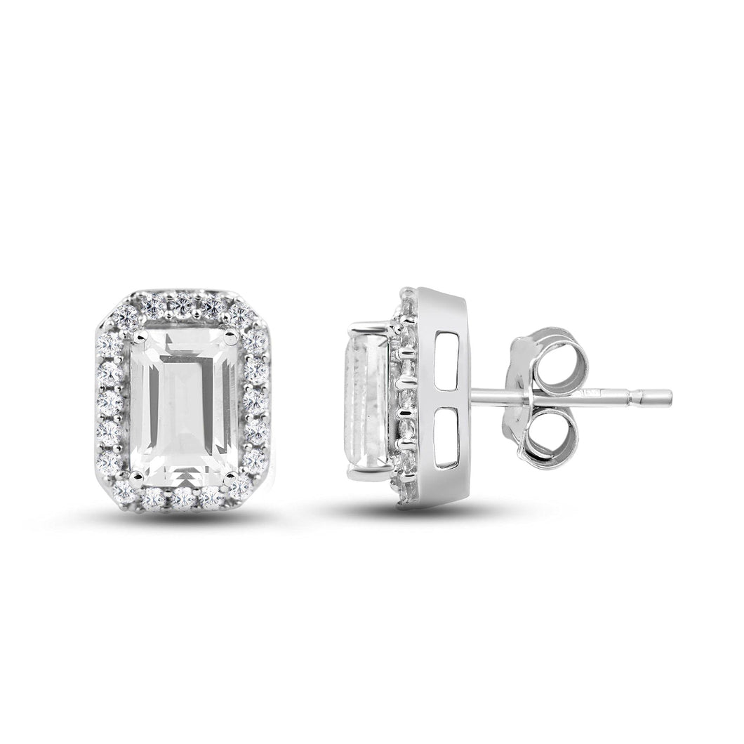 Jewelili Sterling Silver with Octagon Shape and Round Shape Created White Sapphire Stud Earrings