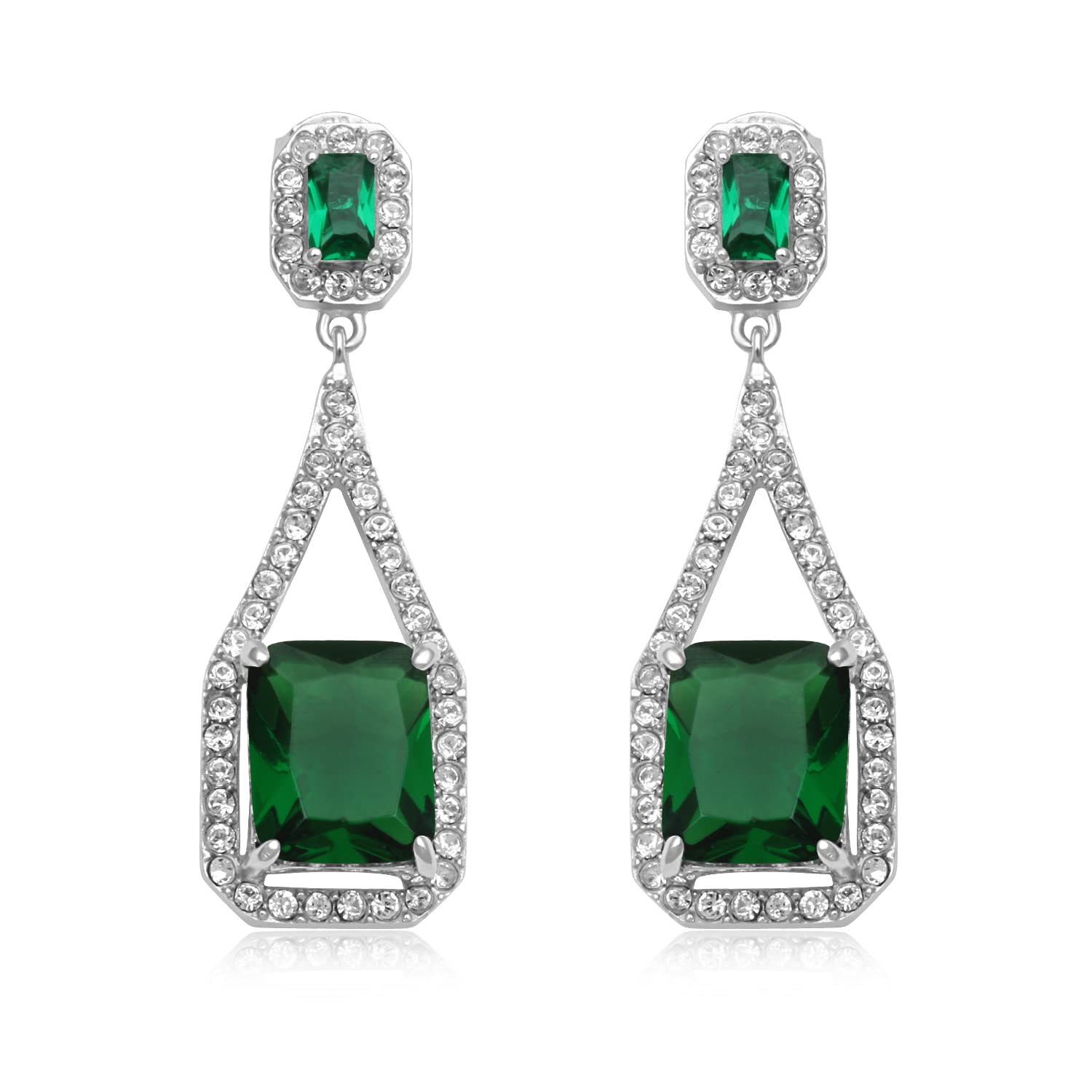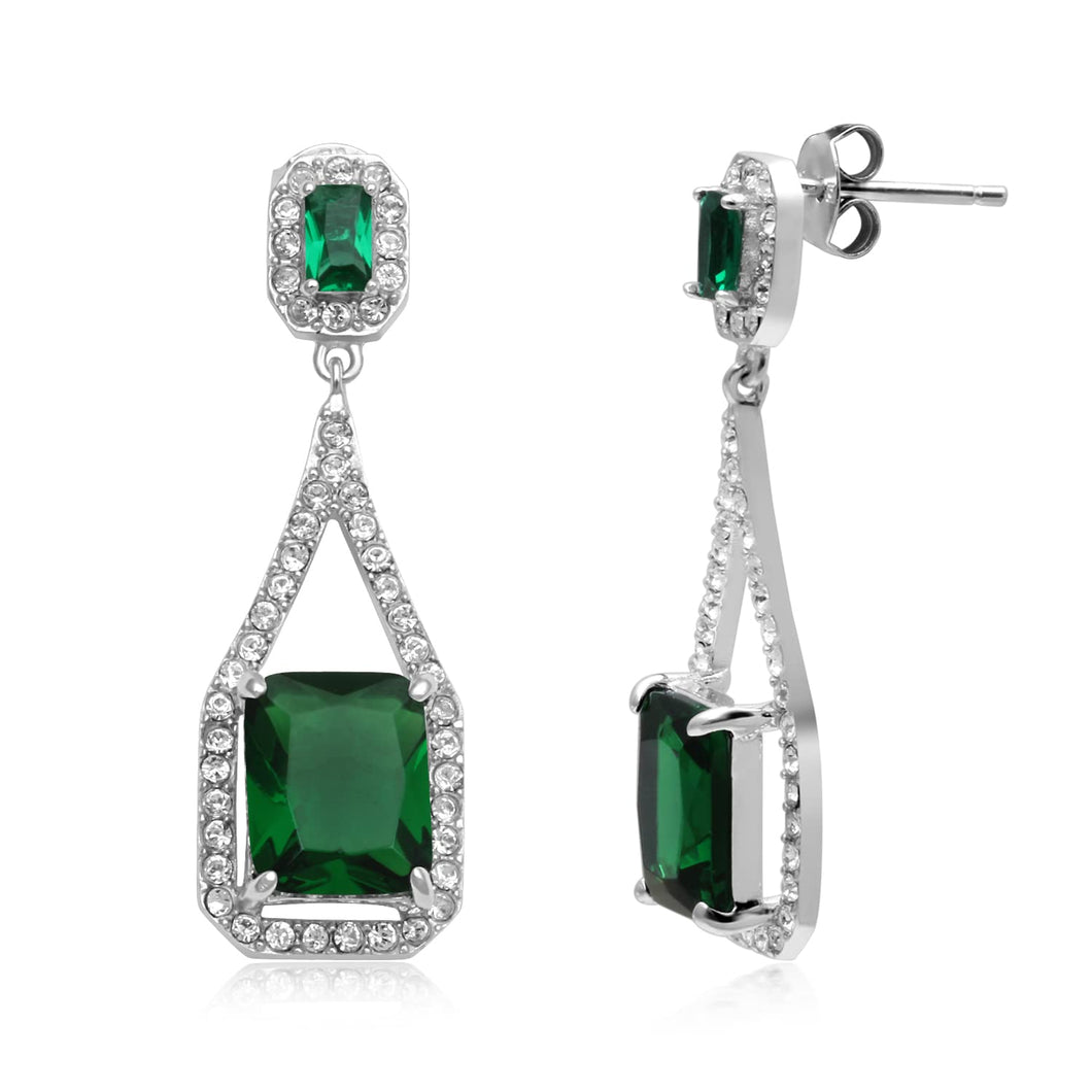 Details: Sterling Silver With Octagon Simulated Green Glass Emerald and Clear Crystal Long Dangle Earrings