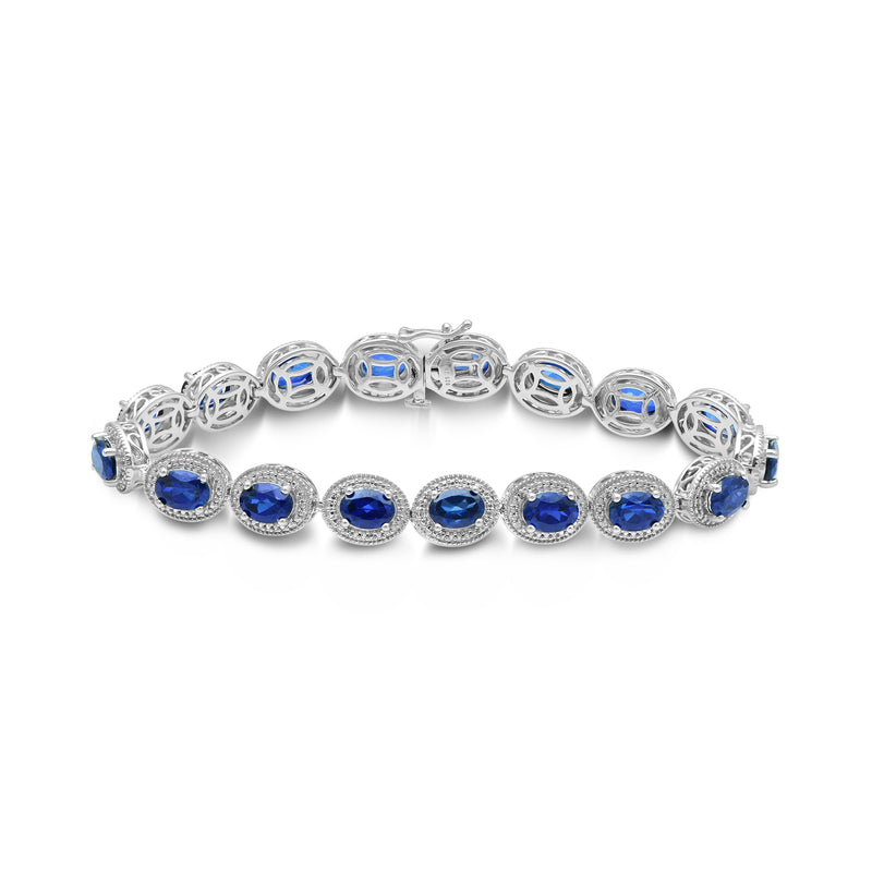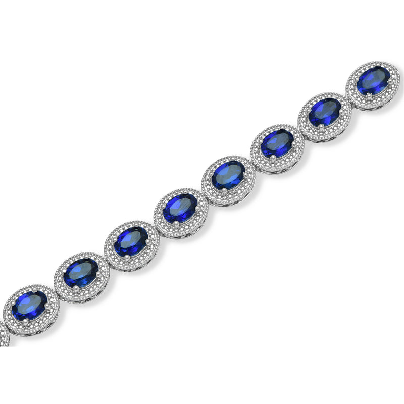 • Sterling Silver with Oval Created Ceylon Sapphire and Natural White Round Diamond Accent Link Bracelet, 7.5"