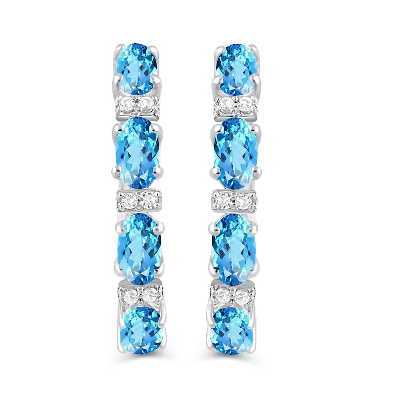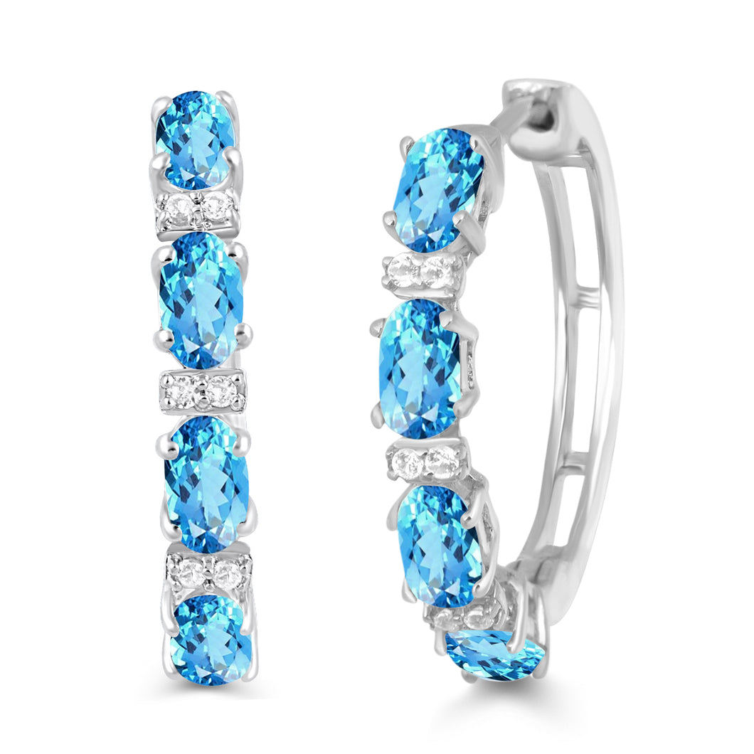 • Sterling Silver with Oval Cut Swiss Blue Topaz and Round Created White Sapphire Hoop Earrings