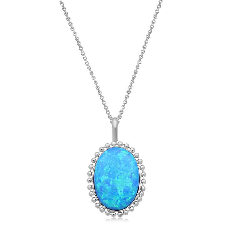 • Sterling Silver with Oval Shape Created Blue Opal Pendant Necklace
