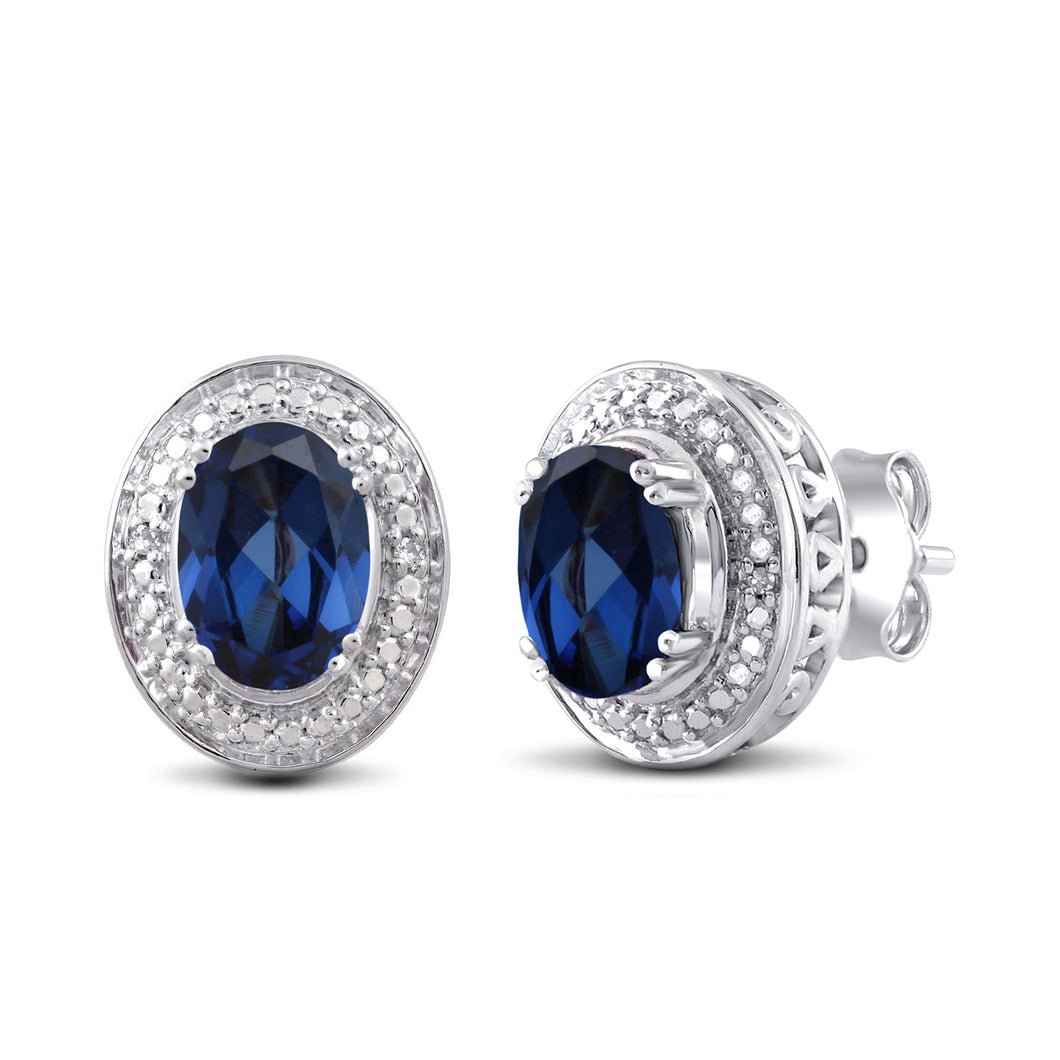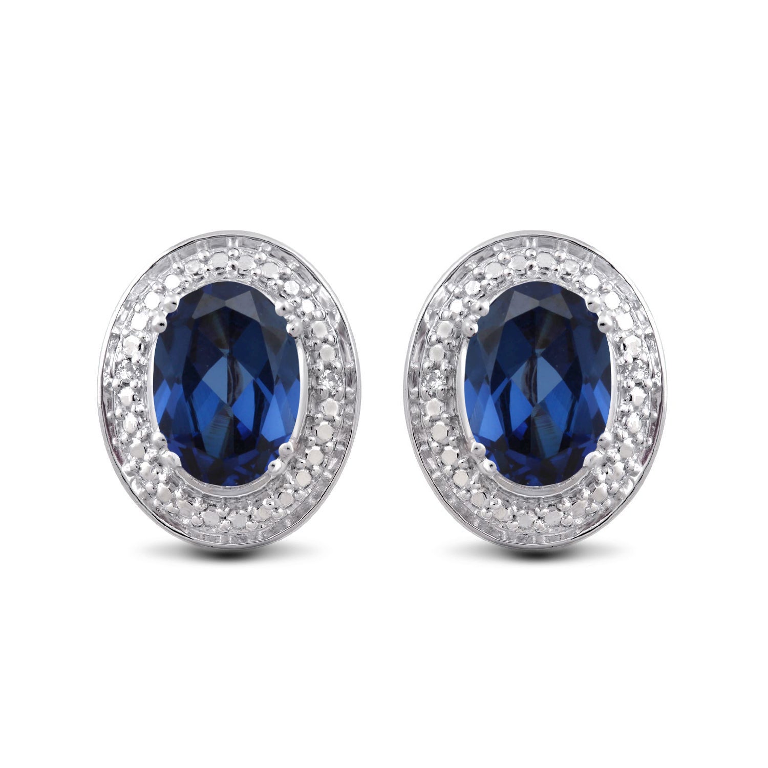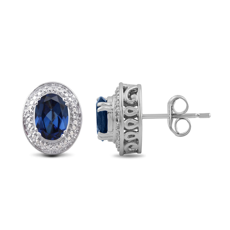 • Sterling Silver with Oval Shape Created Blue Sapphire and Natural White Round Shape Diamond Accent Stud Earrings
